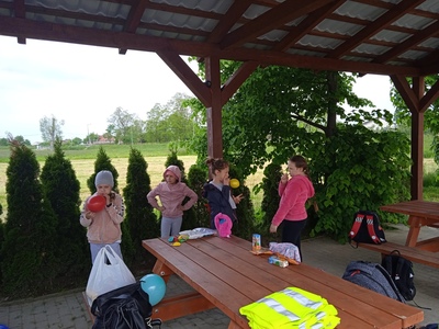 Dzięki naszym Rodzicom p. Frątczak, p Goździeli i p.Stefaniakowi mogliśmy go ciekawie spędzić na świeżym powietrzu. Wybraliśmy się na skwer obok Sali wiejskiej w Sławoszewie. Tam czekały na nas słodycze i napoje. Pan Stefaniak rozpalał już ognisko, nad którym piekliśmy kiełbaski....