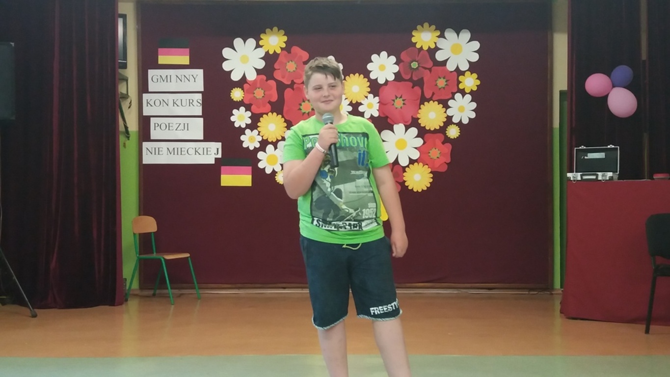 Uczeń klasy IV - Przemek Goły, jako jedyny reprezentował naszą szkołę w Gminnym konkursie poezji niemieckiej, który odbył się 5 czerwca w Szkole Podstawowej w Kotlinie. W kategorii klas IV-VI w konkursie rywalizowało 11 uczniów. Musieli zaprezentować wybrany przez siebie wiersz w języku niemieckim. Jury oceniało interpretację, poprawność językową oraz ogólne walory estetyczne. Uczniom towarzyszyła trema, jak to przy występach bywa, ale zaprezentowali wysoki poziom zarówno językowy jak i artystyczny. Przemek zdobył wyróżnienie. Gratulujemy!!!