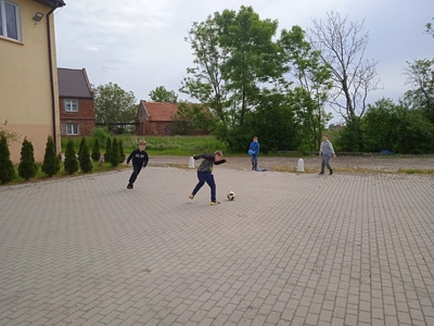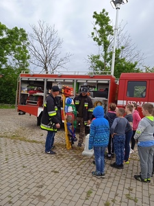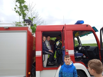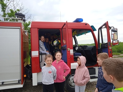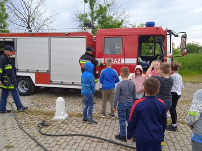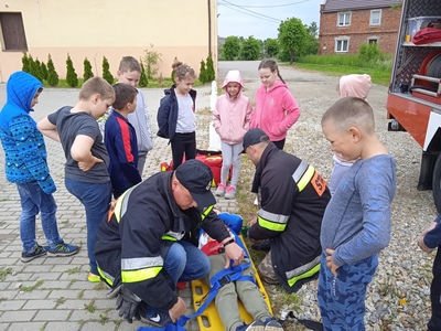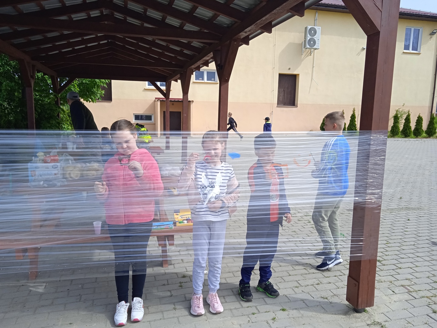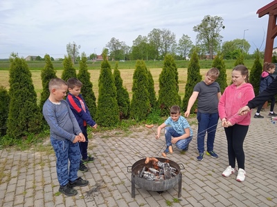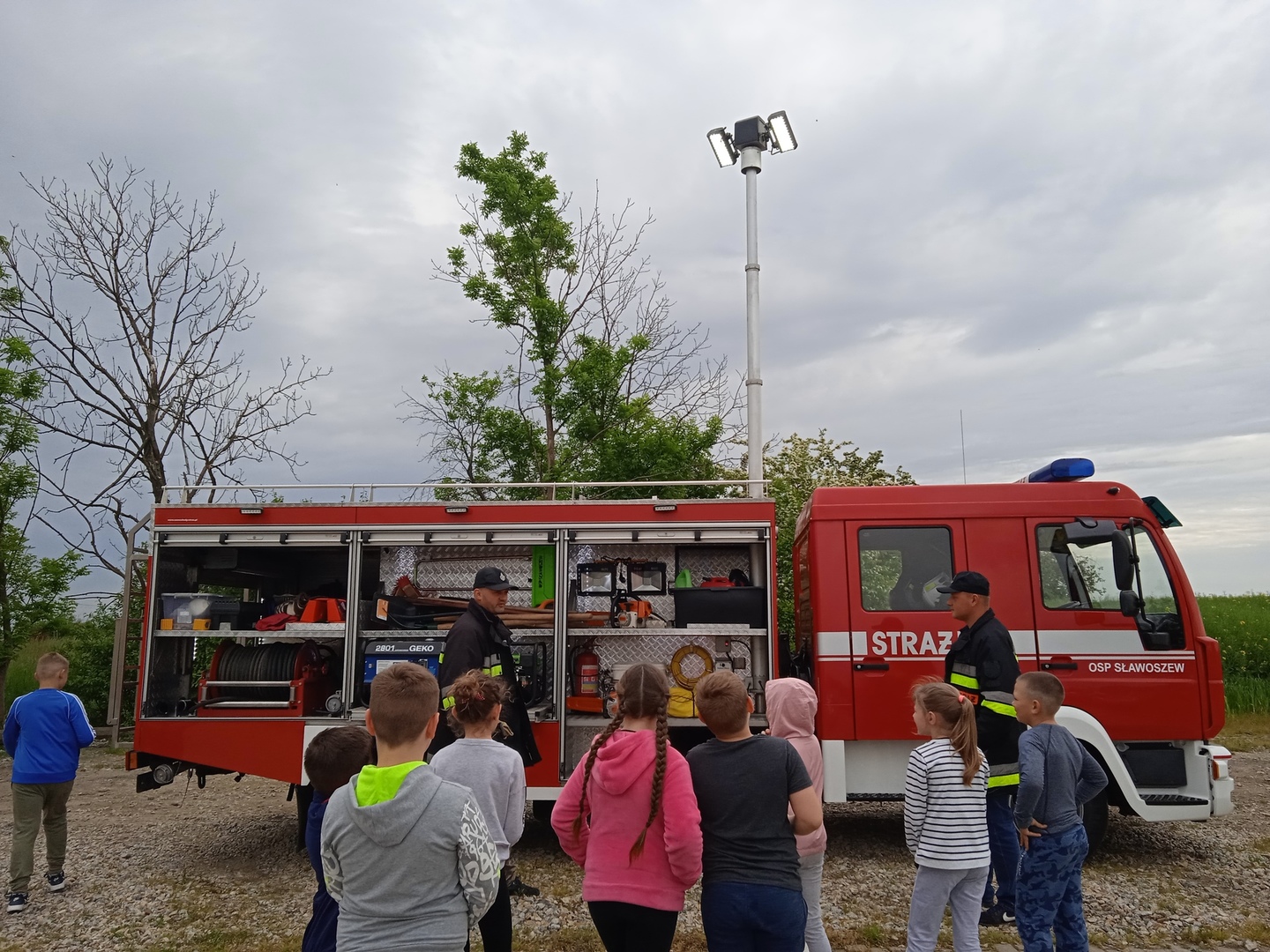 Dzięki naszym Rodzicom p. Frątczak, p Goździeli i p.Stefaniakowi mogliśmy go ciekawie spędzić na świeżym powietrzu. Wybraliśmy się na skwer obok Sali wiejskiej w Sławoszewie. Tam czekały na nas słodycze i napoje. Pan Stefaniak rozpalał już ognisko, nad którym piekliśmy kiełbaski. Potem malowaliśmy farbami na folii, graliśmy w piłkę, bawiliśmy się balonami. Na koniec czekała nas niespodzianka. Panowie strażacy (tu dziękujemy również p. Jędrzejakowi) pokazali nam wóz strażacki; nawet mogliśmy w nim chwilę posiedzieć. W końcu umieścili naszego kolegę na wielkich noszach i jeszcze go przywiązali. Oczywiście to żart, bo panowie pokazywali nam, jak prawidłowo umieścić na takich noszach poszkodowanego. Czas szybko minął i trzeba było się wracać do domu.