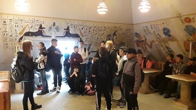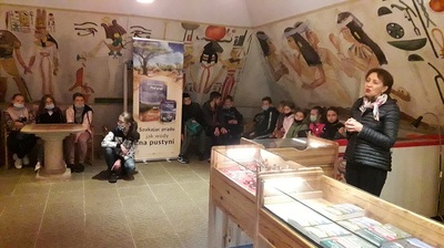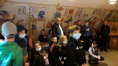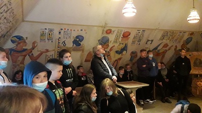 W Muzeum przywitał nas Marek Fiedler, syn pisarza, który nakreślił nam plan zwiedzania. Najpierw udaliśmy się do stojącej w Ogrodzie Kultur i Tolerancji piramidy, gdzie miła pani przewodniczka opowiedziała nam o tajemnicach religii starożytnego Egiptu. Nawiązują do niej malowidła przedstawiające postacie egipskich bogów umieszczone na wewnętrznych ścianach piramidy.