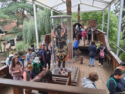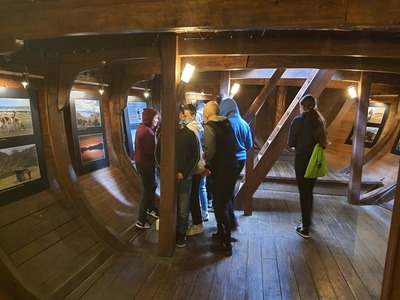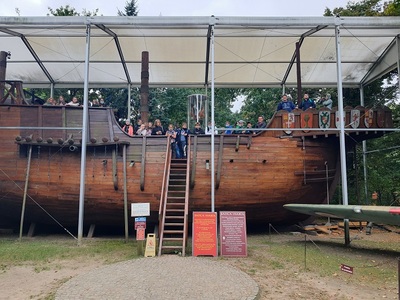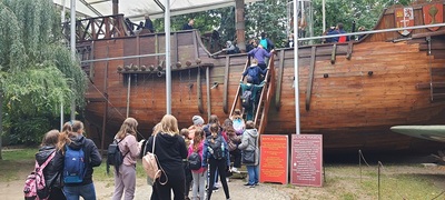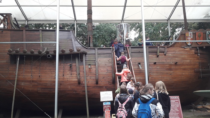 Następnie uczestnicy wycieczki opanowali stojącą w ogrodzie replikę okrętu Krzysztofa Kolumba „Santa Maria”. Zwiedzili pokład, kajutę kapitana, a bardziej ciekawi zajrzeli nawet na dolny pokład. Po zejściu na ląd zapozowali do pamiątkowego zdjęcia na tle statku.