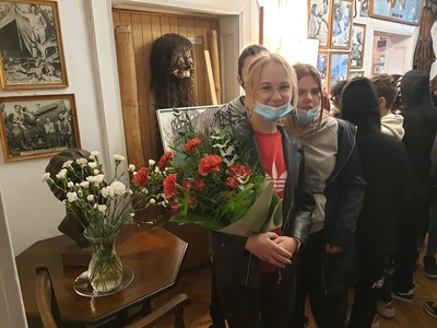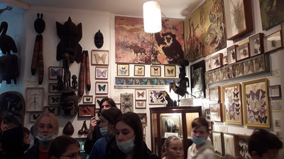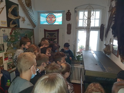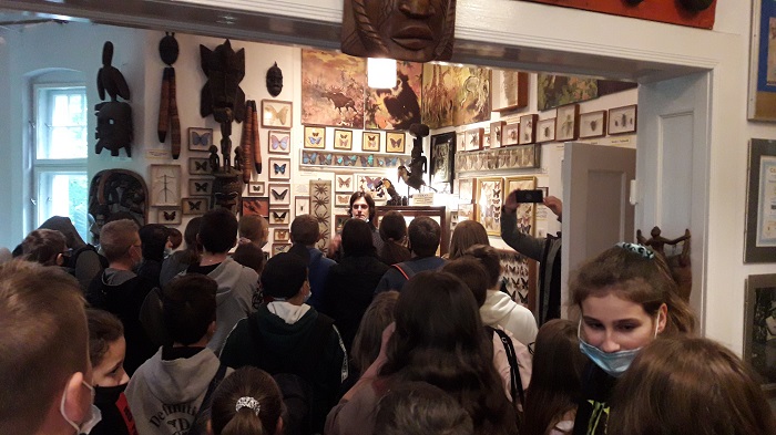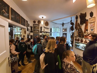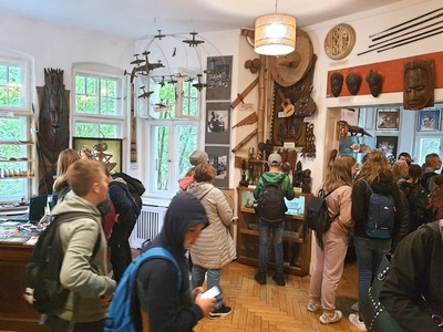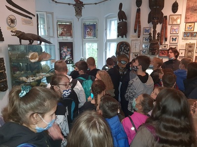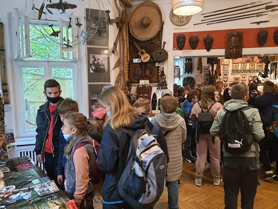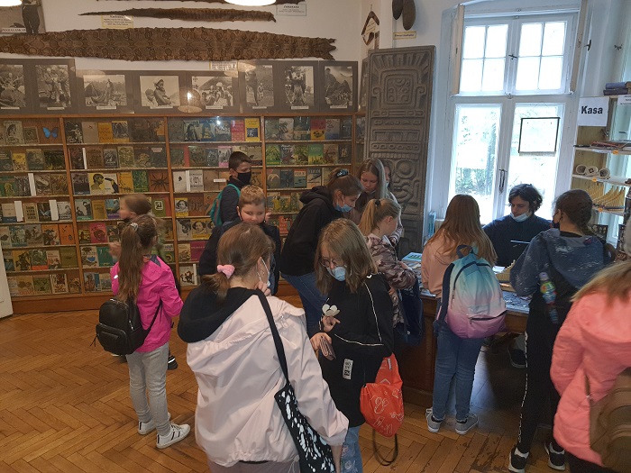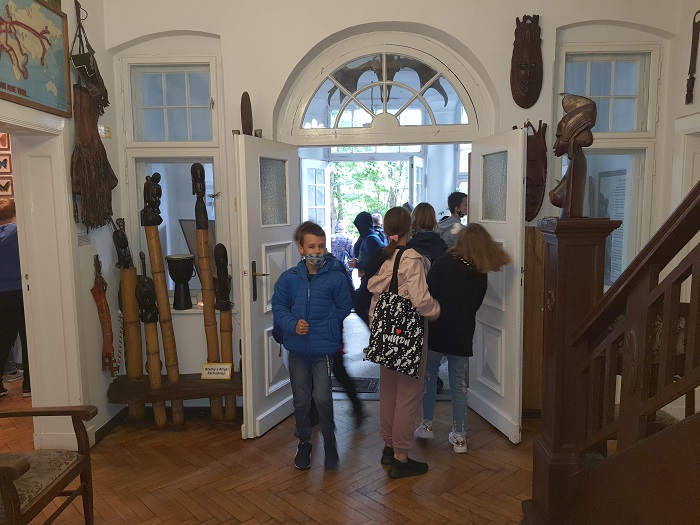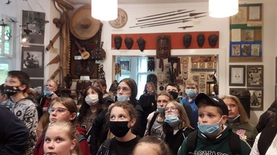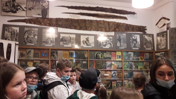 Kolejnym punktem programu było zwiedzanie Muzeum pisarza i podróżnika, w którym zgromadzono kilkaset egzemplarzy wydań jego książek i, przede wszystkim, eksponaty związane z jego egzotycznymi wyprawami. Tym razem naszym przewodnikiem był wnuk naszego Patrona – Marek Oliwier Fiedler. Pokazał nam m. in. gablotki z groźnymi pająkami, pięknymi motylami, skóry węży i ząb słonia.