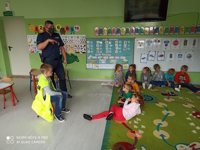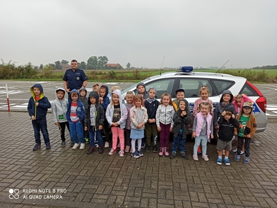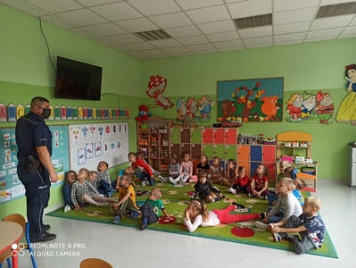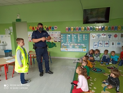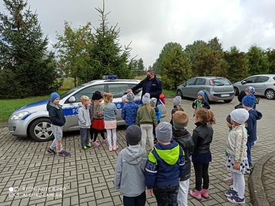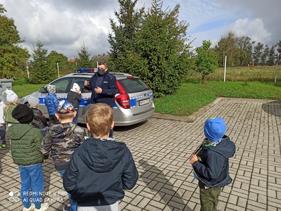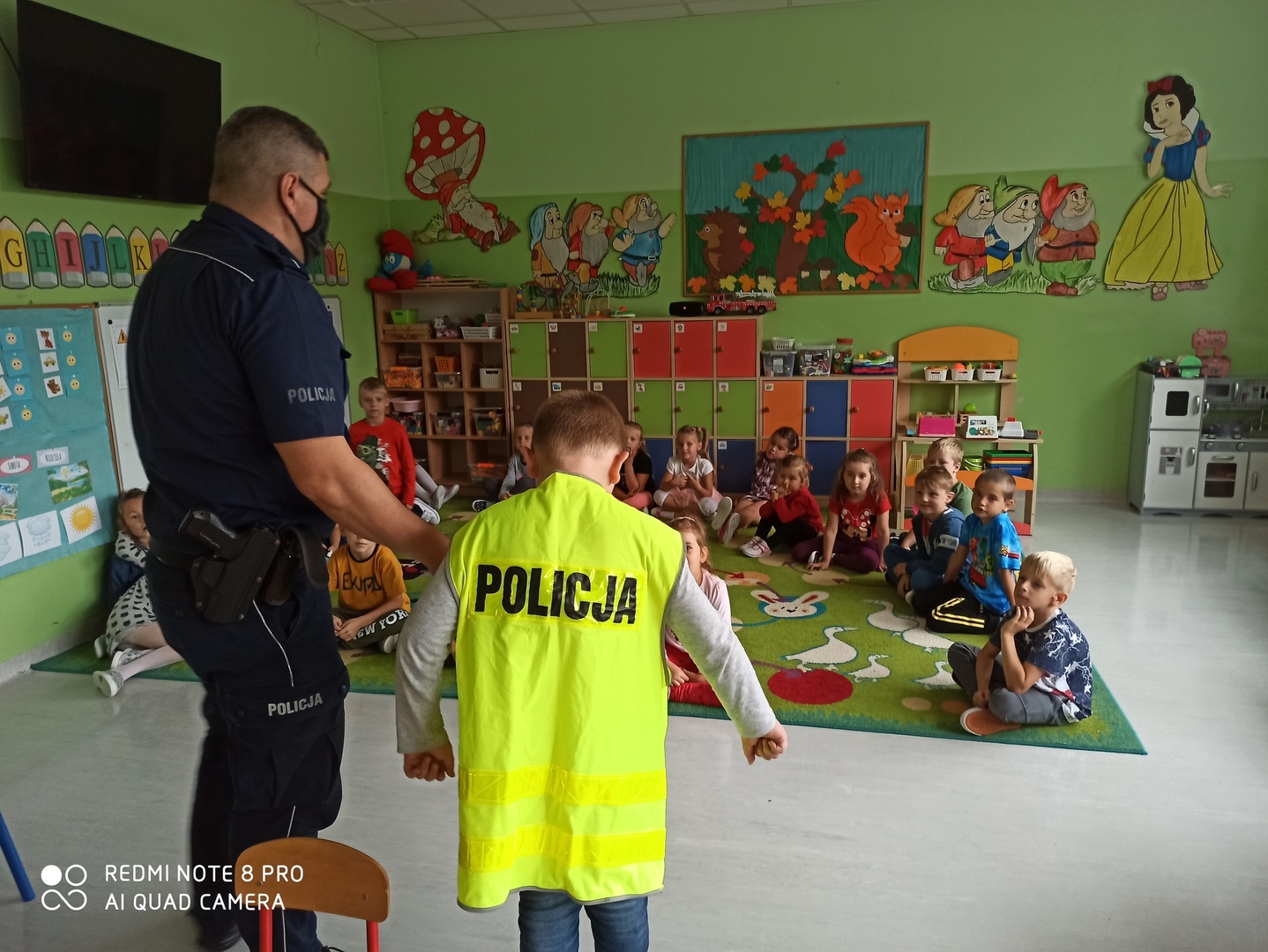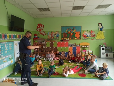 Dnia 16 września nasze przedszkole odwiedził pan policjant, który przybliżył dzieciom zasady bezpiecznej drogi do przedszkola. Dzieci utrwaliły znajomość zasad prawidłowego przejścia przez ulicę oraz przypomniały sobie niektóre znaki drogowe. Zostały zapoznane z niebezpieczeństwami grożącymi im podczas drogi do przedszkola, nauczyły się jak prawidłowo korzystać z jezdni. Dzieci miały również okazję dowiedzieć się na czym polega praca pana policjanta, jak wygląda jego mundur oraz jaki sprzęt jest mu potrzebny podczas służby. Największą jednak atrakcją był samochód policyjny, który cieszył się dużym zainteresowanie nie tyko chłopców, ale też dziewczynek.