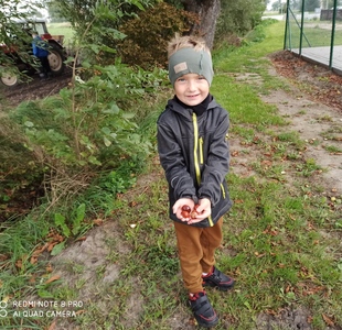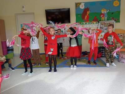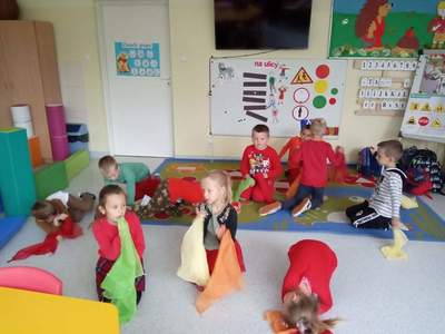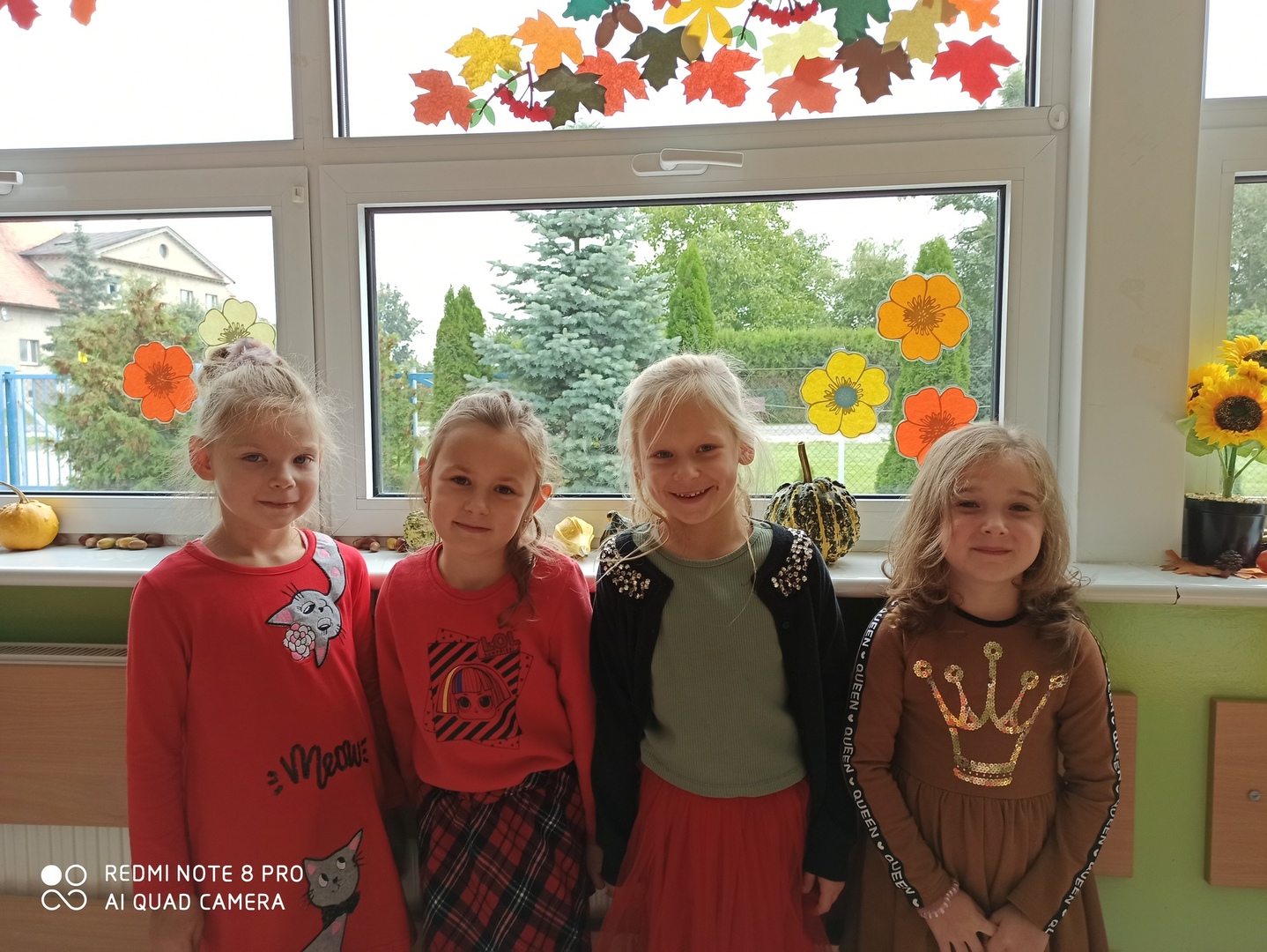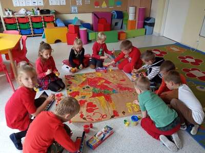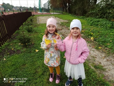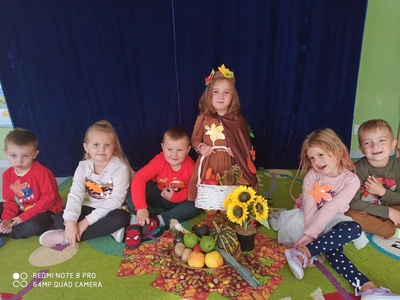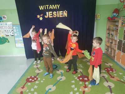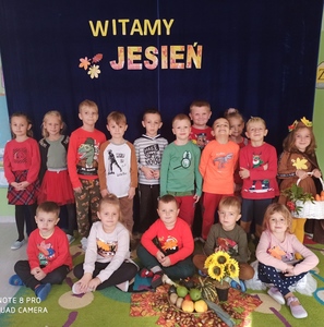23 września dzieci z naszego przedszkola powitały Pierwszy Dzień Jesieni. Tego dnia ,,królowały kolory": czerwony, brązowy, pomarańczowy i żółty. Przedszkolaków odwiedziła Pani Jesień z koszem swoich jesiennych darów. Organizowane były zabawy o tematyce jesiennej, poprzez które dzieci przyswoiły sobie wiadomości o rozpoczynającej się właśnie porze roku. Dzieci śpiewały i tańczyły przy piosenkach „Kolorowe listki”, „Małe czerwone jabłuszko” a także namalowały postać Pani Jesieni. Nie zabrakło też poszukiwania oznak jesieni podczas spaceru.