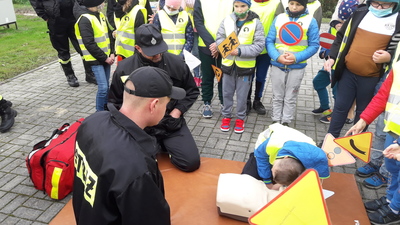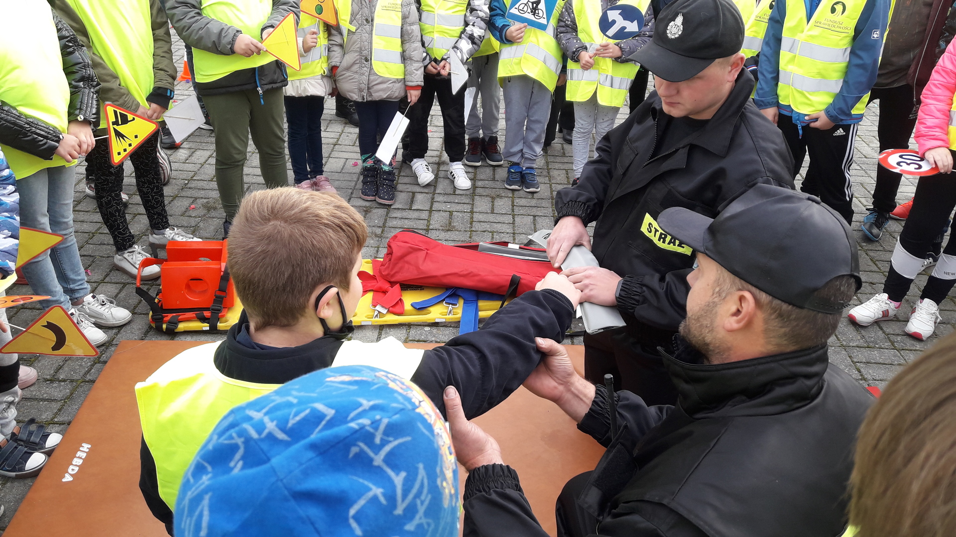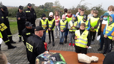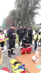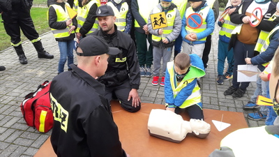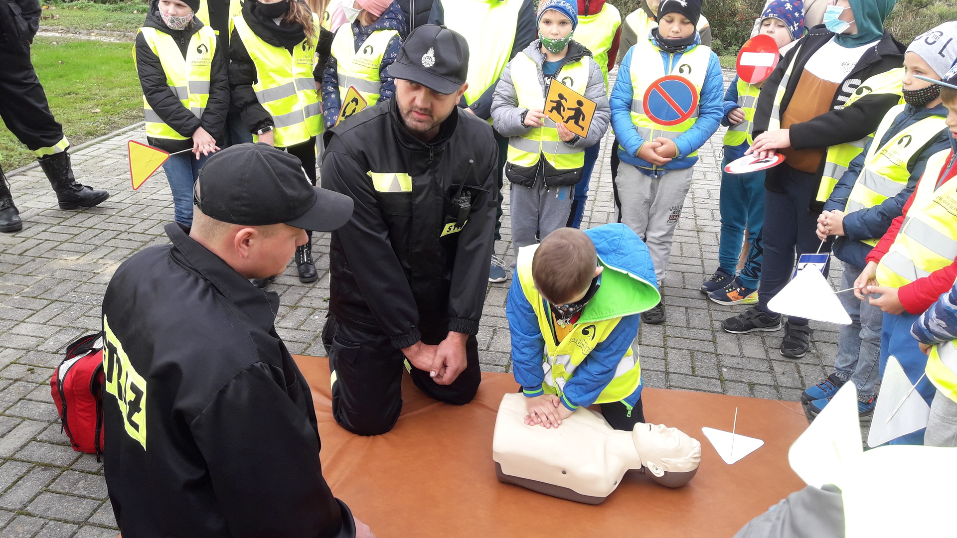 Ostatnim, ale równie ważnym punktem uroczystości było szkolenie z zasad udzielania pierwszej pomocy, które przeprowadzili dla uczniów strażacy z OSP Sławoszew. Strażaków otoczyła grupa zainteresowanych, ale też, trzeba przyznać, zorientowanych w temacie dzieci. Pewnie odpowiadały na pytania naszych instruktorów i brały udział w ćwiczeniach. Wskazówki doświadczonych w akcjach ratunkowych strażaków spotkały się z bardzo pozytywnym przyjęciem.