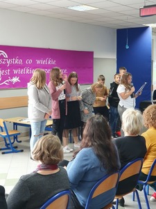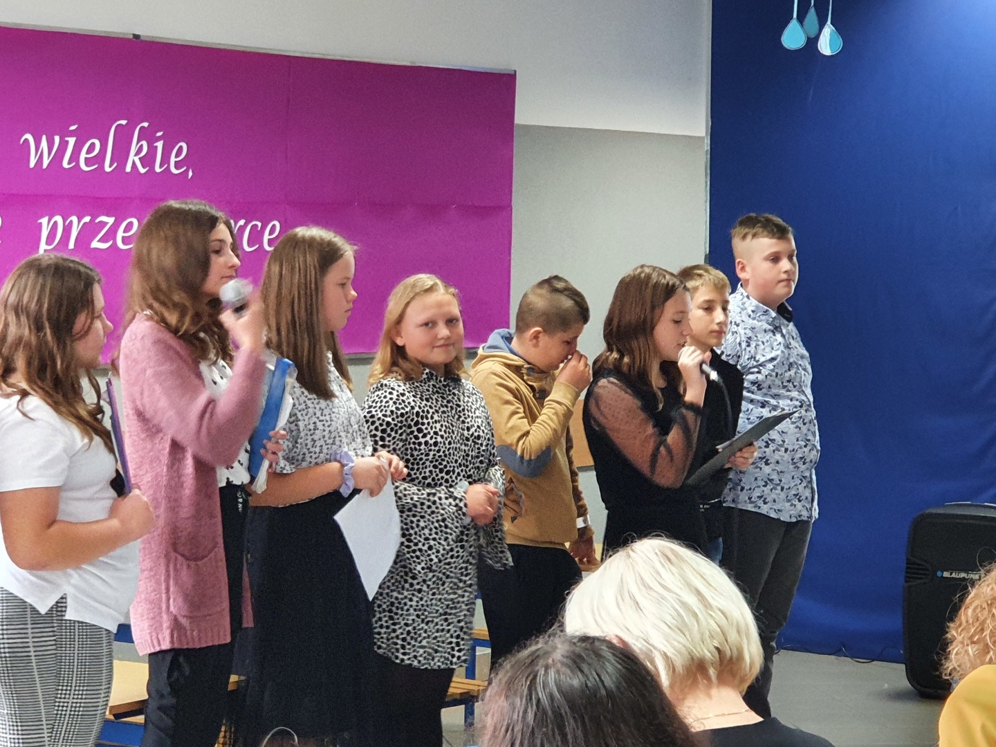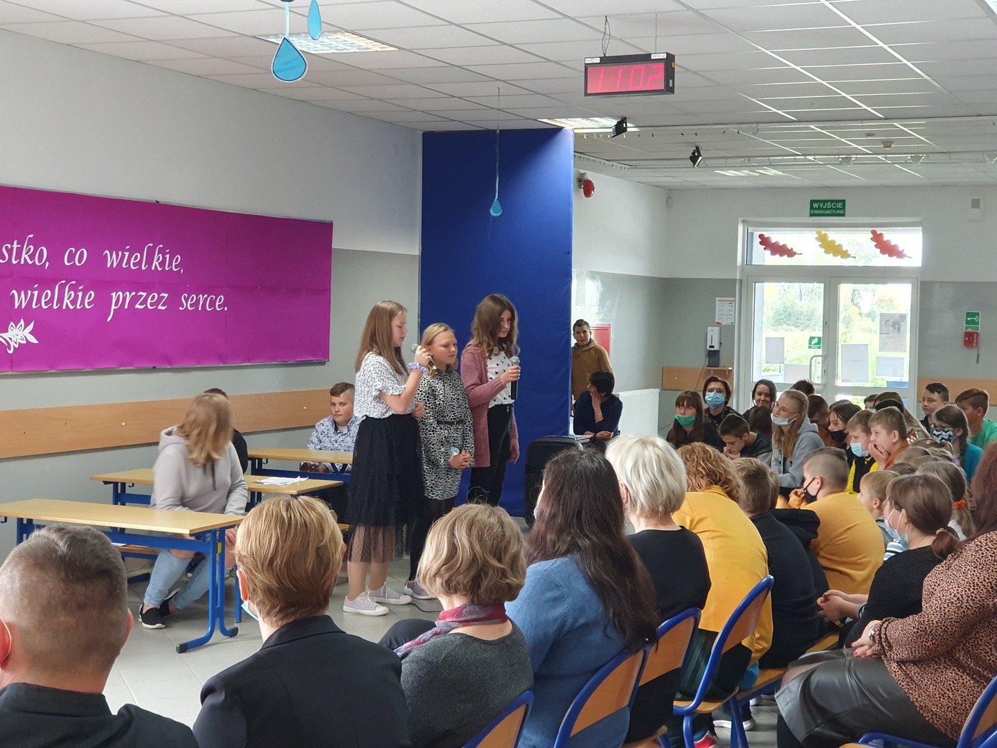 Oprócz scenek uznanie publiczności zyskały piosenki „14 października” i „Szkolne życzenia” zaprezentowane przez wokalistki z kl. VI, które ćwiczyły pod kierunkiem p. Eweliny Mróz.
