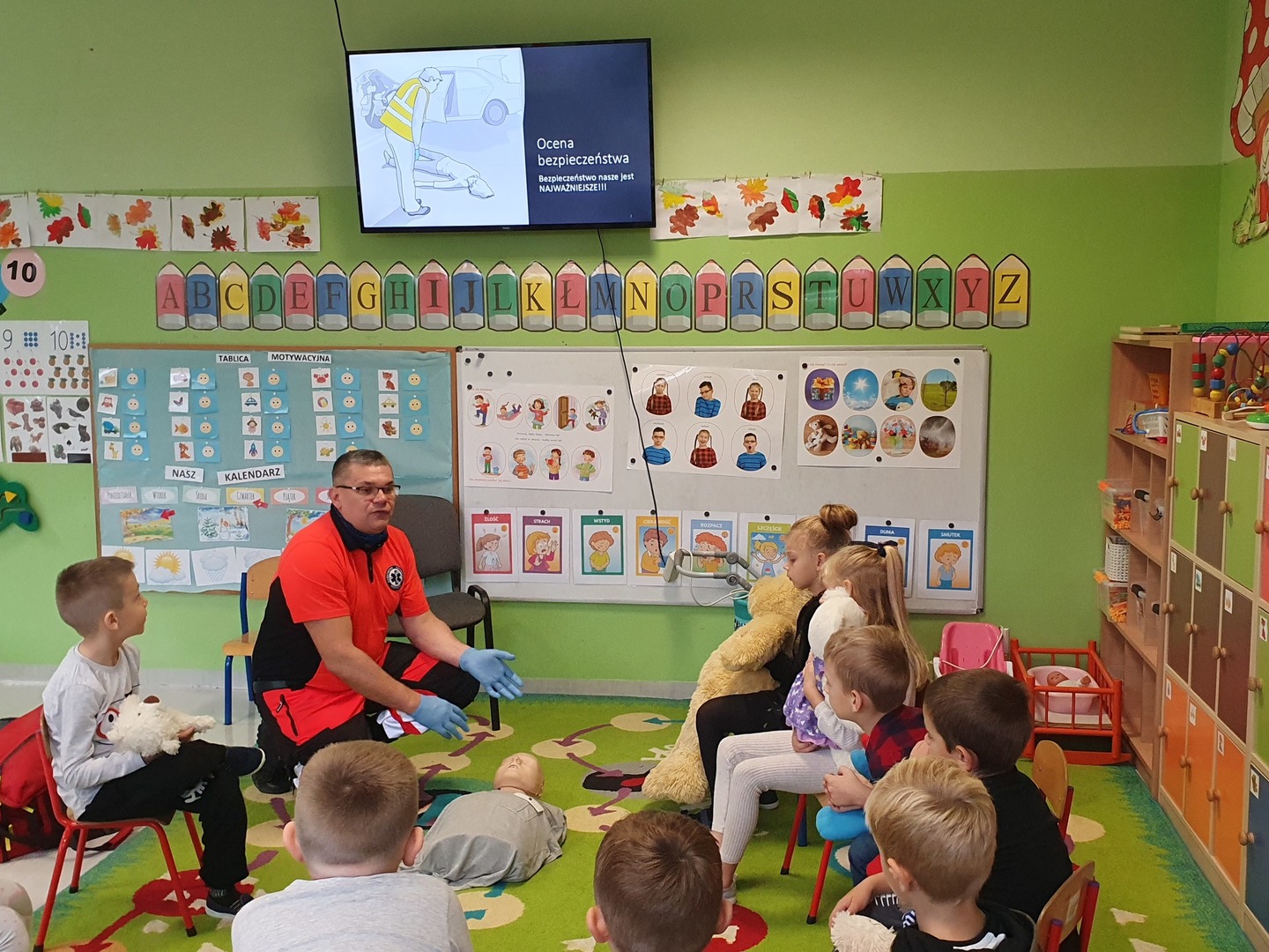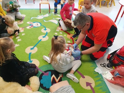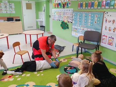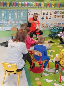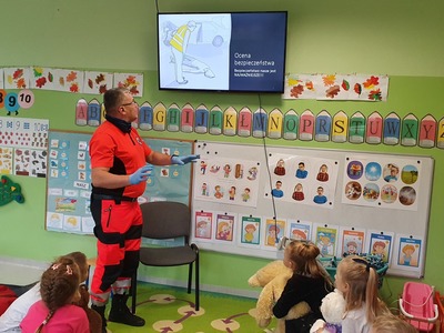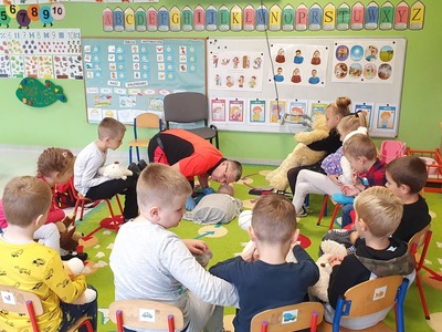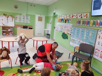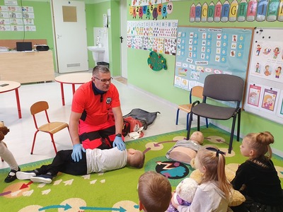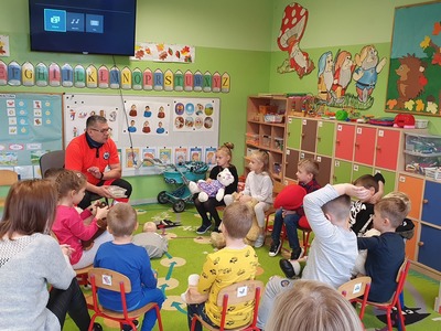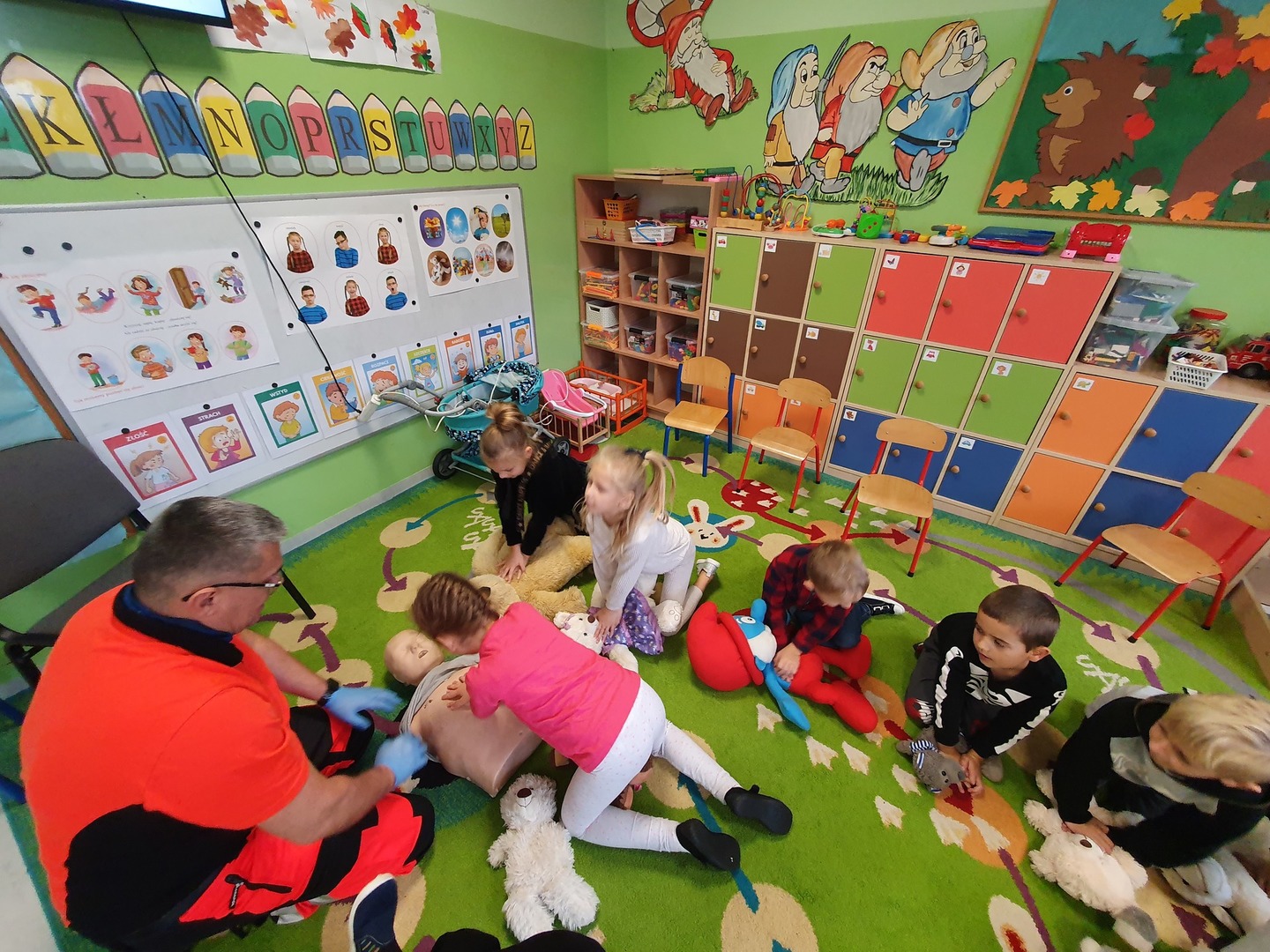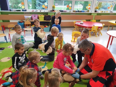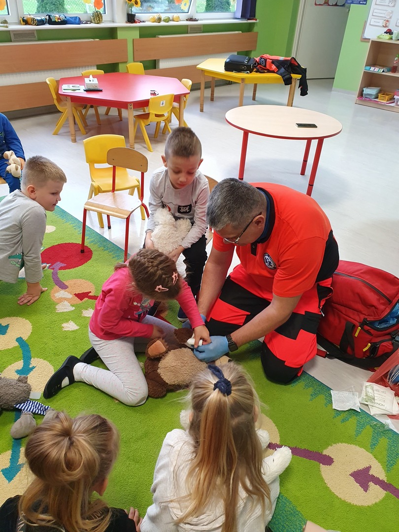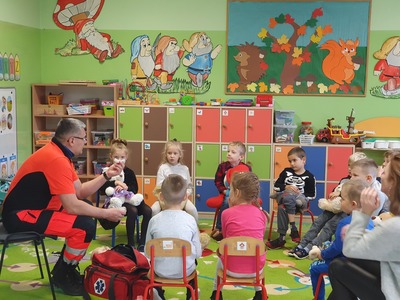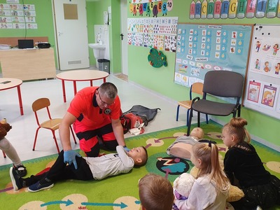 Dnia 22 października dzieci z naszego przedszkola odwiedził pan Witold Szymczak - ratownik medyczny z Pleszewskiego Centrum Medycznego. Dzieci miały okazję wysłuchać informacji na temat udzielania pierwszej pomocy. Przedszkolaki uczyły się, w jaki sposób można komuś pomóc zanim przyjedzie pogotowie ratunkowe. Dowiedziały się jak należy sprawdzać przytomność osoby poszkodowanej oraz w jaki sposób wzywać pomoc. Przy tej okazji utrwaliły sobie numery alarmowe. Poznały wyposażenie torby ratownika medycznego oraz wyposażenie karetki. Dzięki takiej lekcji dzieci nauczyły się wielu ważnych rzeczy, które w przyszłości być może przyczynią się do uratownia komuś życia. Za tą wspaniała lekcję dzieci oraz pracownicy serdecznie dziękują panu Witkowi oraz Pleszewskiemu Centrum Medycznemu.