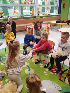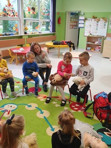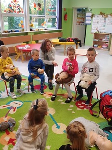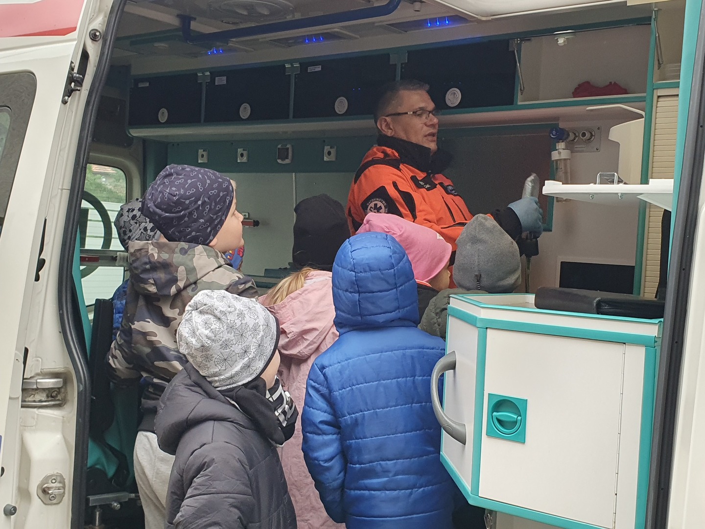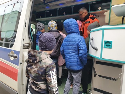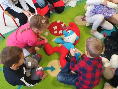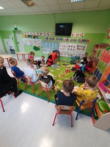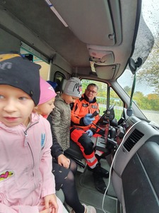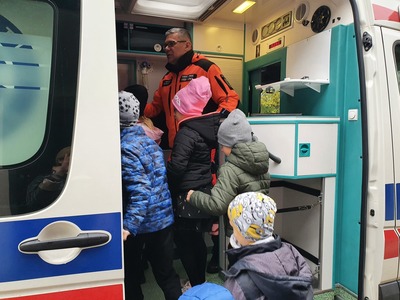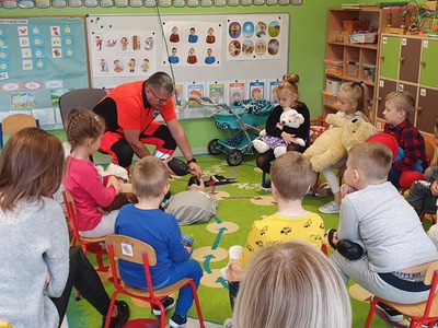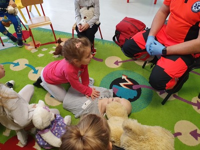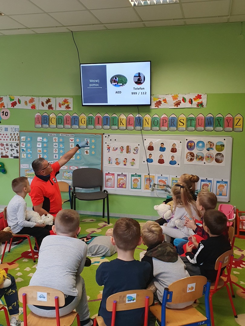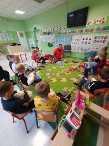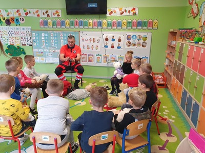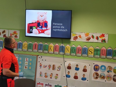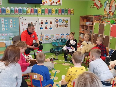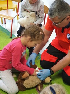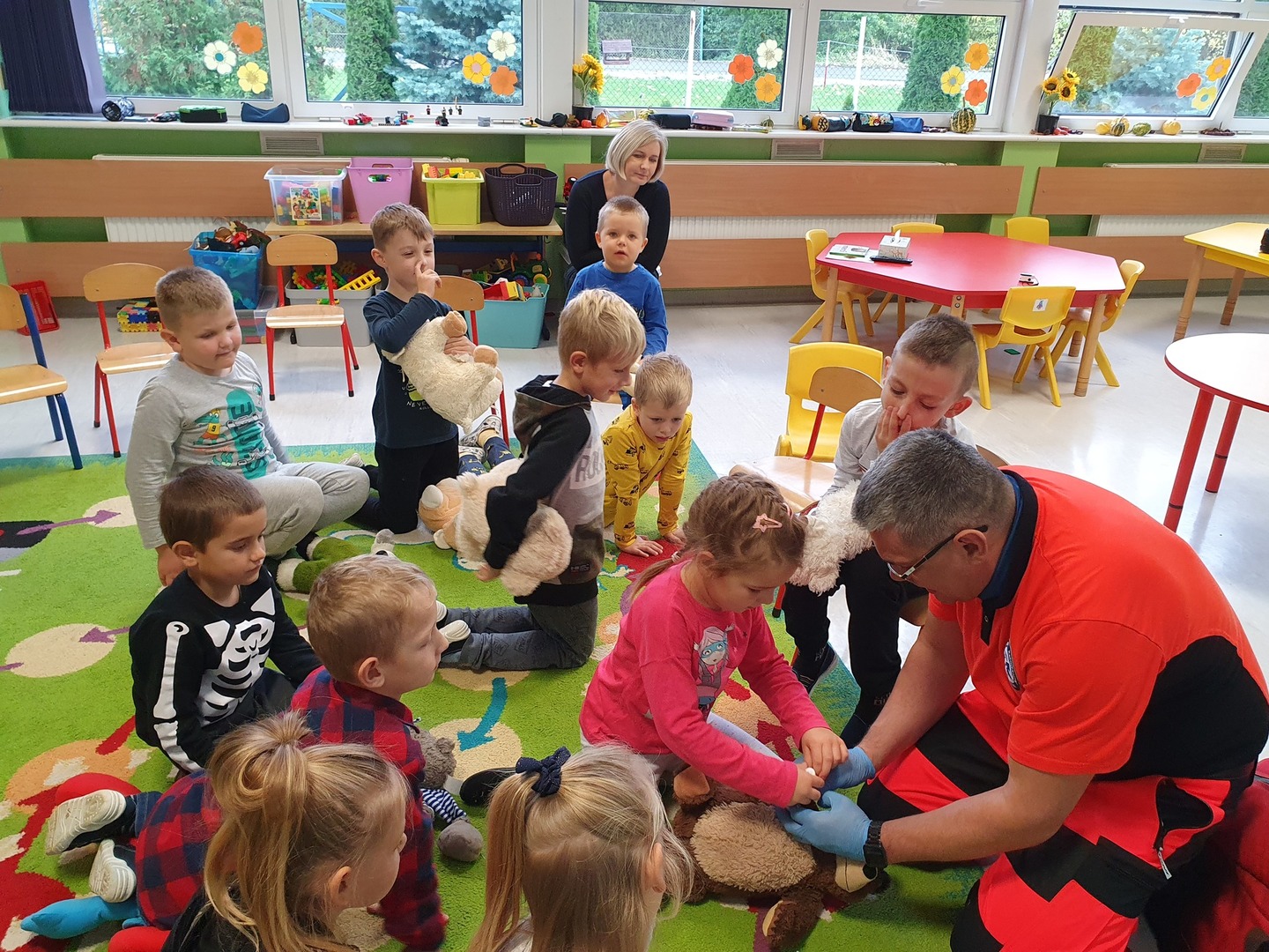 Dnia 22 października dzieci z naszego przedszkola odwiedził pan Witold Szymczak - ratownik medyczny z Pleszewskiego Centrum Medycznego. Dzieci miały okazję wysłuchać informacji na temat udzielania pierwszej pomocy. Przedszkolaki uczyły się, w jaki sposób można komuś pomóc zanim przyjedzie pogotowie ratunkowe. Dowiedziały się jak należy sprawdzać przytomność osoby poszkodowanej oraz w jaki sposób wzywać pomoc. Przy tej okazji utrwaliły sobie numery alarmowe. Poznały wyposażenie torby ratownika medycznego oraz wyposażenie karetki. Dzięki takiej lekcji dzieci nauczyły się wielu ważnych rzeczy, które w przyszłości być może przyczynią się do uratownia komuś życia. Za tą wspaniała lekcję dzieci oraz pracownicy serdecznie dziękują panu Witkowi oraz Pleszewskiemu Centrum Medycznemu.