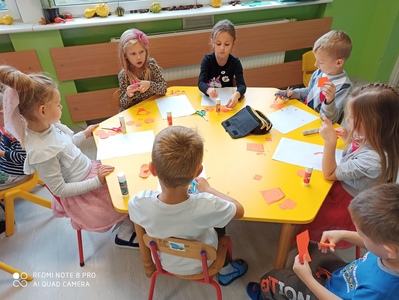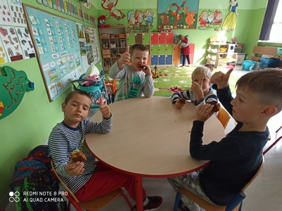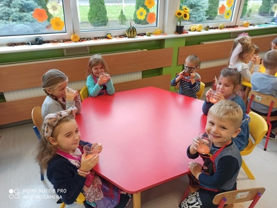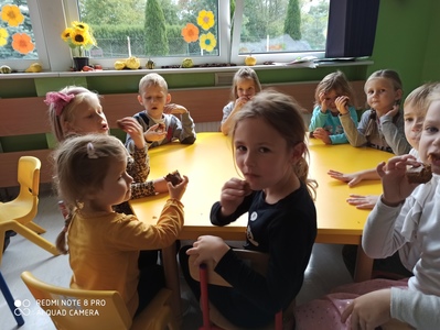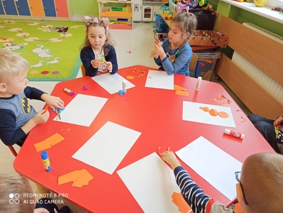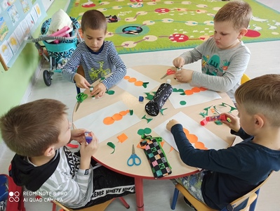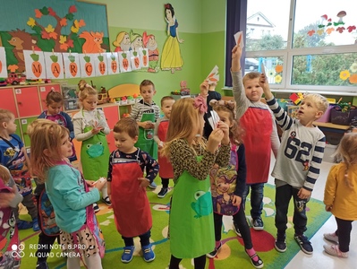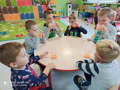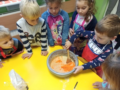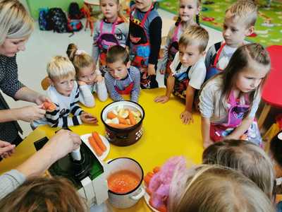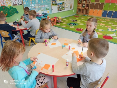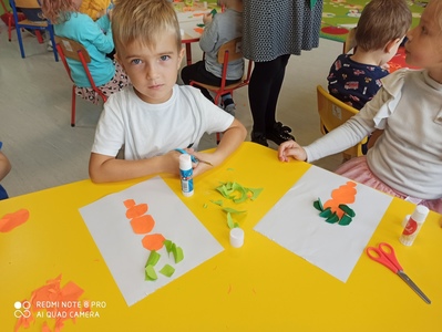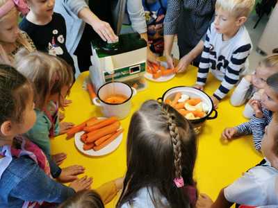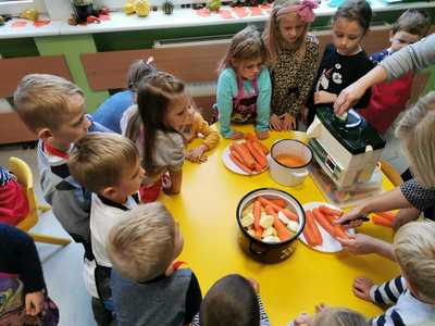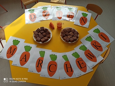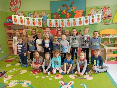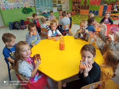 6 października świętowaliśmy w przedszkolu Dzień Marchewki. Zabawy rozpoczął wspólny taniec przy piosence ,,Urodziny marchewki". Odbyła się pogadanka na temat zdrowego odżywiania oraz walorów zdrowotnych marchewki. Dzieci pomagały przy pieczeniu ciasta marchewkowego. Panie przygotowały pyszny sok z marchewki i jabłek. Po zakończonej zabawie dzieci degustowały upieczone ciasto marchewkowe i popijały sokiem owocowo - warzywnym. Na koniec dzieci wykonały piękne prace plastyczne, w których główną rolę grała marchewka.