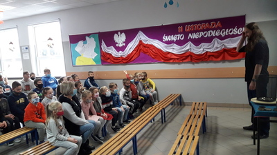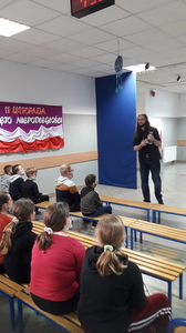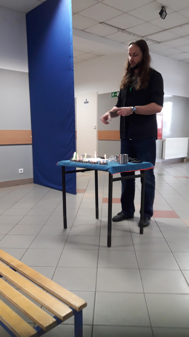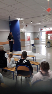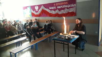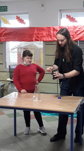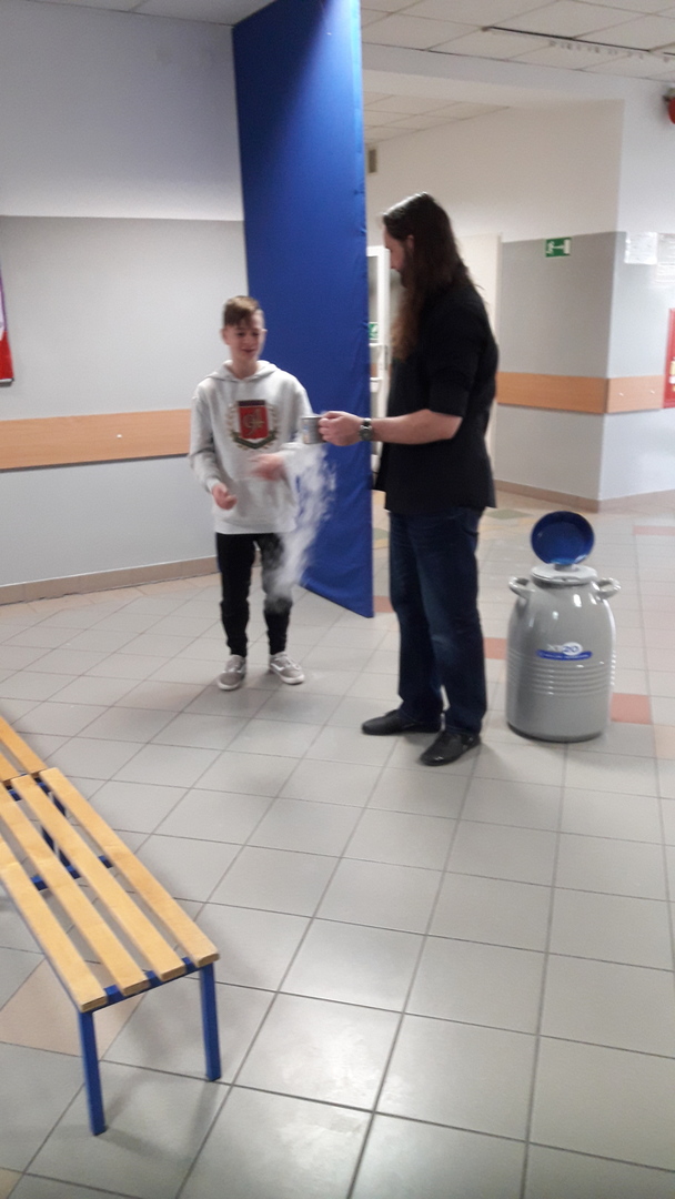Gościem szkoły był p. Mateusz Łucki z firmy EduEvent. Specjalizuje się ona w propagowaniu atrakcyjnej edukacji poprzez wykonywanie pokazów przyrodniczych. Przedstawił on kilka eksperymentów, jak sam określił „od najprostszych do hardcorowych”. Jego poczynania były pilnie obserwowane przez uczniów, z którymi prowadzący zajęcia szybko nawiązał kontakt i którzy chętnie odpowiadali na zadawane przez niego pytania.
