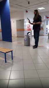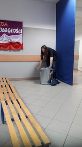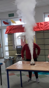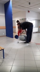 Następnie p. Mateusz przeprowadził kolejne doświadczenie z ciekłym azotem – ono z kolei miało bardzo wybuchowy finał. Uwiecznione na zdjęciach zaskoczenie odmalowane na twarzach widowni pokazuje, jakie wrażenie wywołał ten eksperyment.