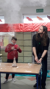 Doświadczenia zaś miały różny charakter i można je było odbierać prawie wszystkimi zmysłami. Widzieliśmy więc spalanie substancji chemicznych objawiające się różnymi kolorami płomieni. Ochotnicy z widowni mogli uczestniczyć w eksperymencie z ciekłym azotem i na własnej skórze odczuć jego „chłodzące” działanie. „Zzimniło mi palce” – skomentował jeden z ósmoklasistów. J