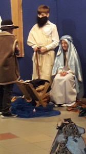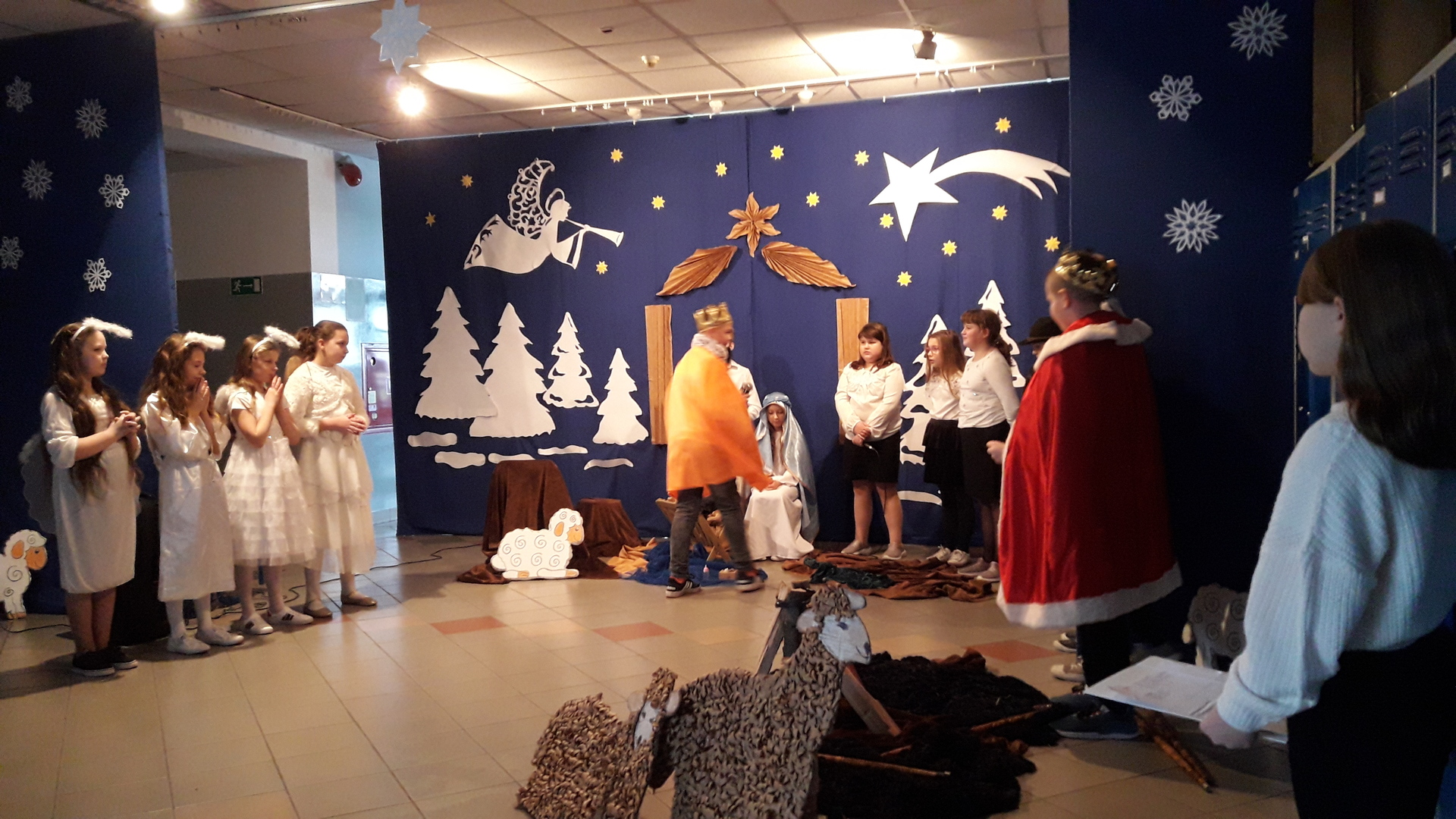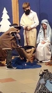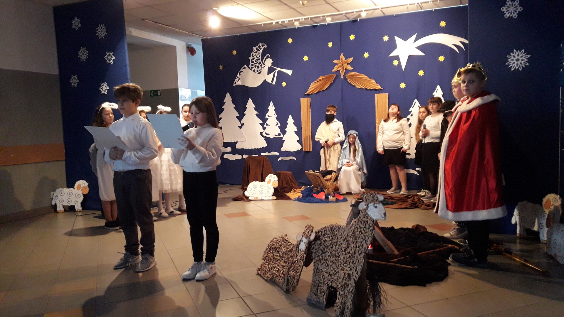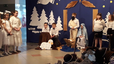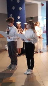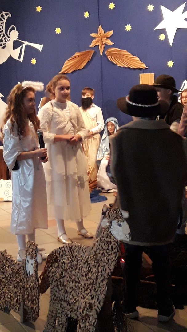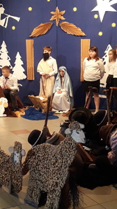 Podczas jasełek podziwialiśmy talent aktorski dzieci wcielających się w Matkę Boską, świętego Józefa, anioły, pastuszków, trzech królów oraz dzieci, które ofiarowały Jezusowi swoje serca. W trakcie występu publiczność wysłuchała zaśpiewanych z werwą polskich kolęd, a swój wkład w oprawę muzyczną włożyli Kacper i Dawid z kl. V, którzy pokazali swoją wrażliwą, artystyczną stronę i zagrali na fletach.