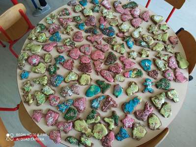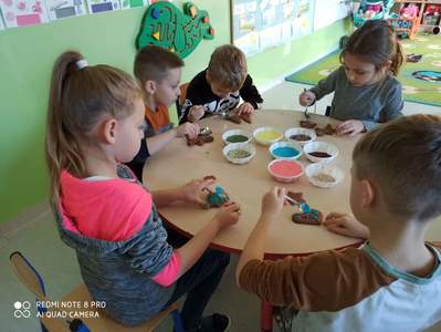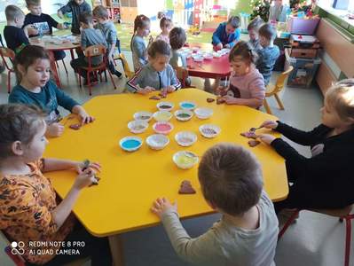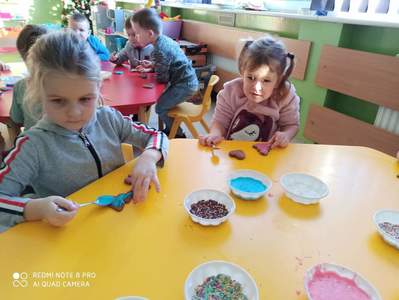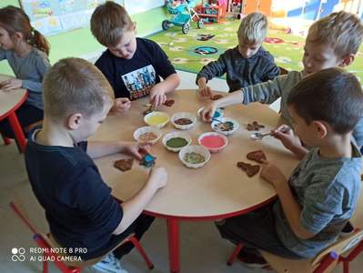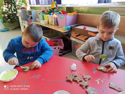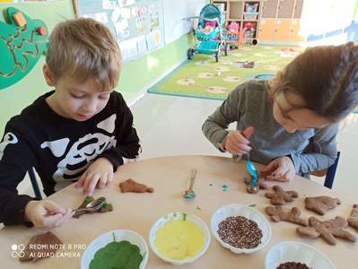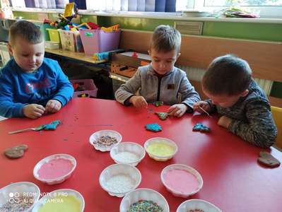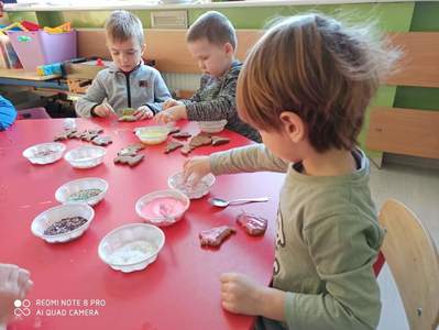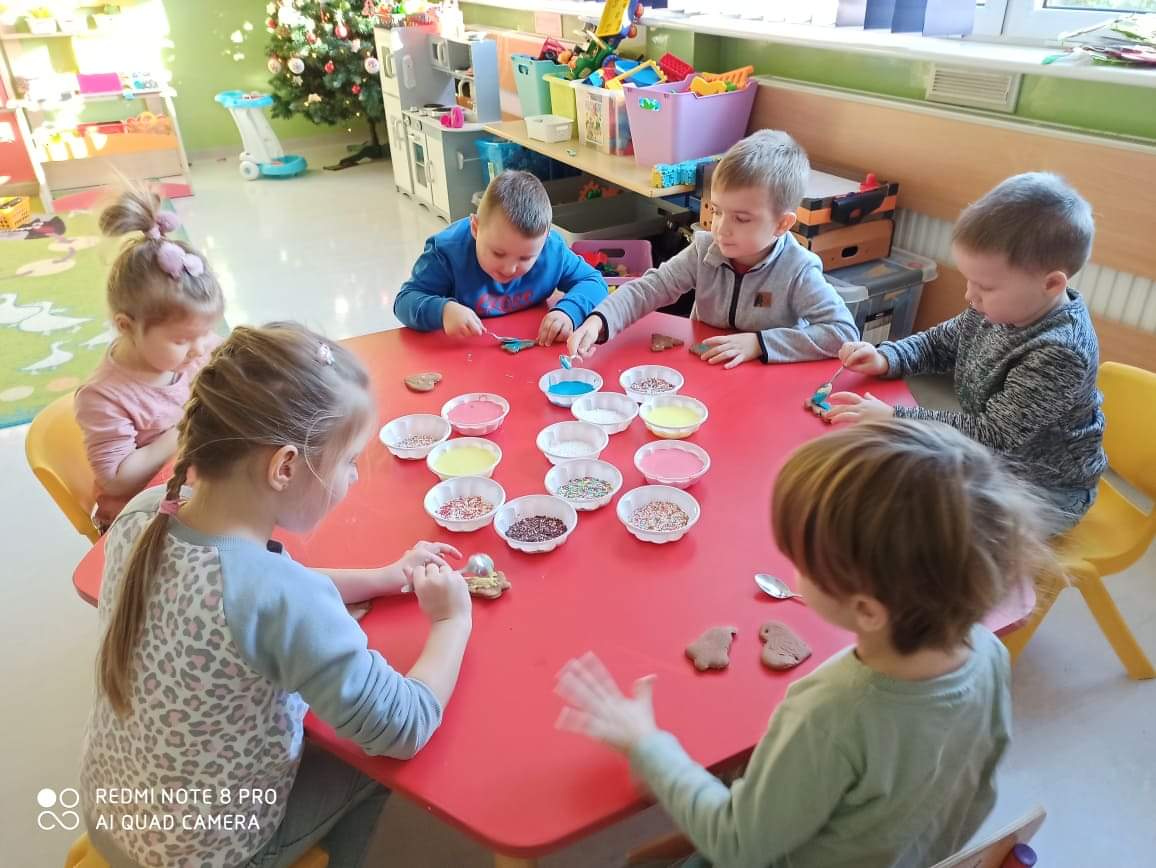 Następnie pierniki trafiły do piekarnika a unoszący się wspaniały zapach, wprawił wszystkich w świąteczny nastrój. Gdy pierniczki były już gotowe dzieci przystąpiły do ich dekorowania lukrem i barwnymi posypkami. Zabawa była doskonała a pierniczki wyszły nie tylko smaczne ale i piękne.
