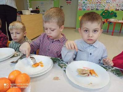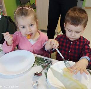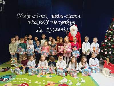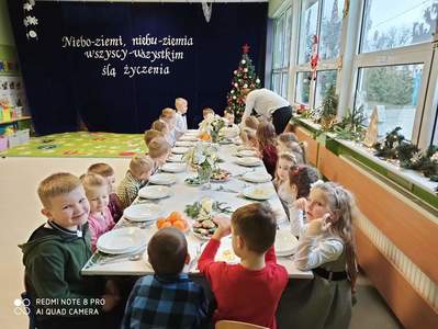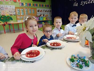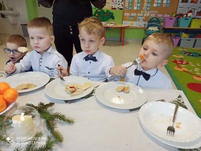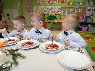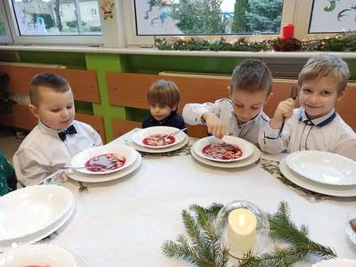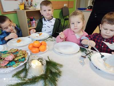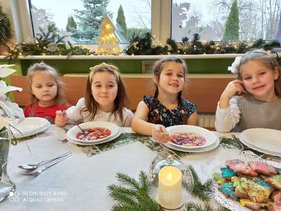 17 grudnia dzieci przyszły do przedszkola odświętnie ubrane. Przy dźwiękach kolęd i pastorałek, zasiadły przy pięknie udekorowanym stole. Panie z przedszkola złożyły dzieciom świąteczne życzenia, po czym wszyscy mogli smakować tradycyjnych potraw tj. barszczyku, pierogów oraz ryby. Przedszkole odwiedził też Gwiazdor, który obdarował dzieci prezentami. Takie podniosłe chwile nie tylko utrwalają dzieciom znajomość tradycji i zwyczajów świątecznych, lecz również co najważniejsze- wzmacniają bliskie i serdeczne relacje.