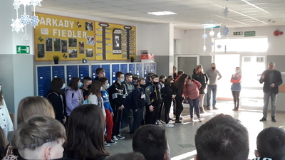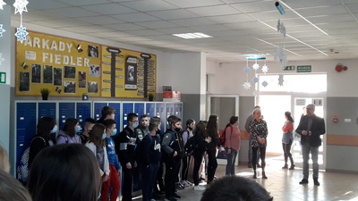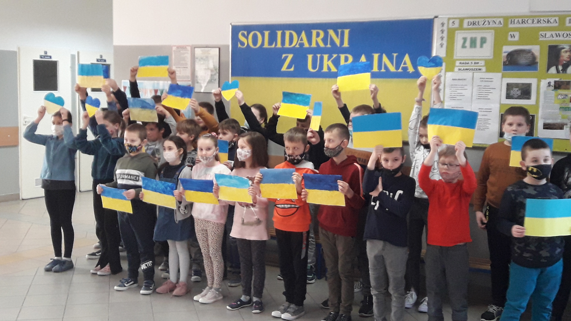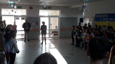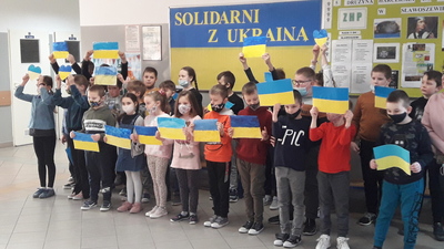 1 marca na holu odbyło się spotkanie szkolnej społeczności na temat sposobów pomocy narodowi ukraińskiemu, który od 24 lutego doświadcza okrucieństwa wojny. Nasza szkoła włączyła się w pomoc humanitarną dla Ukraińców. Wskazówek w imieniu swoim i pani Iwony Jagodzińskiej udzieliła pani Dorota Będziecha. Obie panie koordynują działania Szkolnego Koła Wolontariatu, które organizuje zbiórkę ubrań, żywności, środków czystości, materiałów opatrunkowych i innych rzeczy (lista została już publikowana na stronie internetowej szkoły i szkolnym Facebooku). Pani Będziecha przypomniała, że ubrania i maskotki powinny być w dobrym stanie, a żywność o długim terminie przydatności do spożycia.