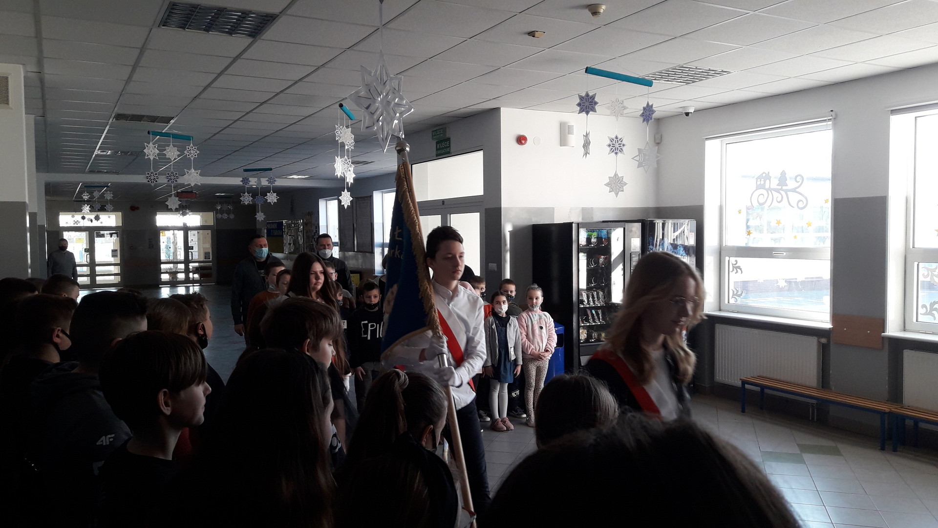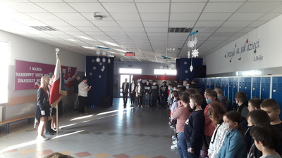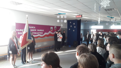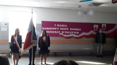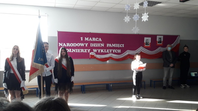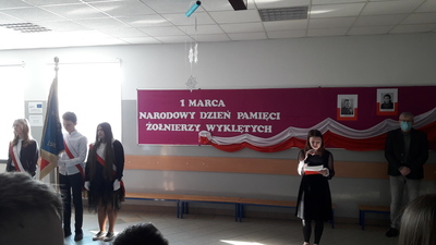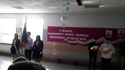 Z tej okazji uczniowie i nauczyciele naszej szkoły spotkali się na apelu, podczas którego oddali cześć Żołnierzom Niezłomnym. Po wprowadzeniu szkolnego sztandaru i odśpiewaniu hymnu narodowego zebrani na holu zostali zapoznani z dramatyczną, a często i tragiczną historią bojowników o wolność. Wśród 4 tysięcy zamordowanych patriotów znaleźli się wspomniani na naszym apelu18-letnia sanitariuszka Danuta Siedzikówna, pseudonim „Inka” oraz dobrowolny więzień Obozu Auschwitz- Witold Pilecki. Narracja historyczna została uzupełniona wierszem Zbigniewa Herberta „Wilki”, który mówi o ciężkim, partyzanckim losie Żołnierzy Wykletych.