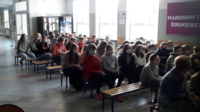 Publiczności zgromadzonej na szkolnym holu przypadły również do gustu piosenki zaśpiewane przez przebojowych trzecioklasistów, których do występu przygotowała wychowawczyni, pani Dorota Będziecha.