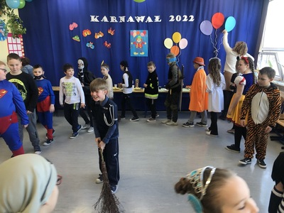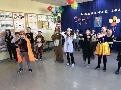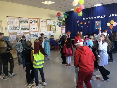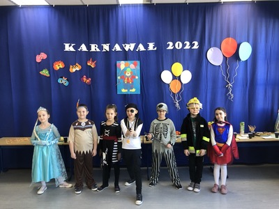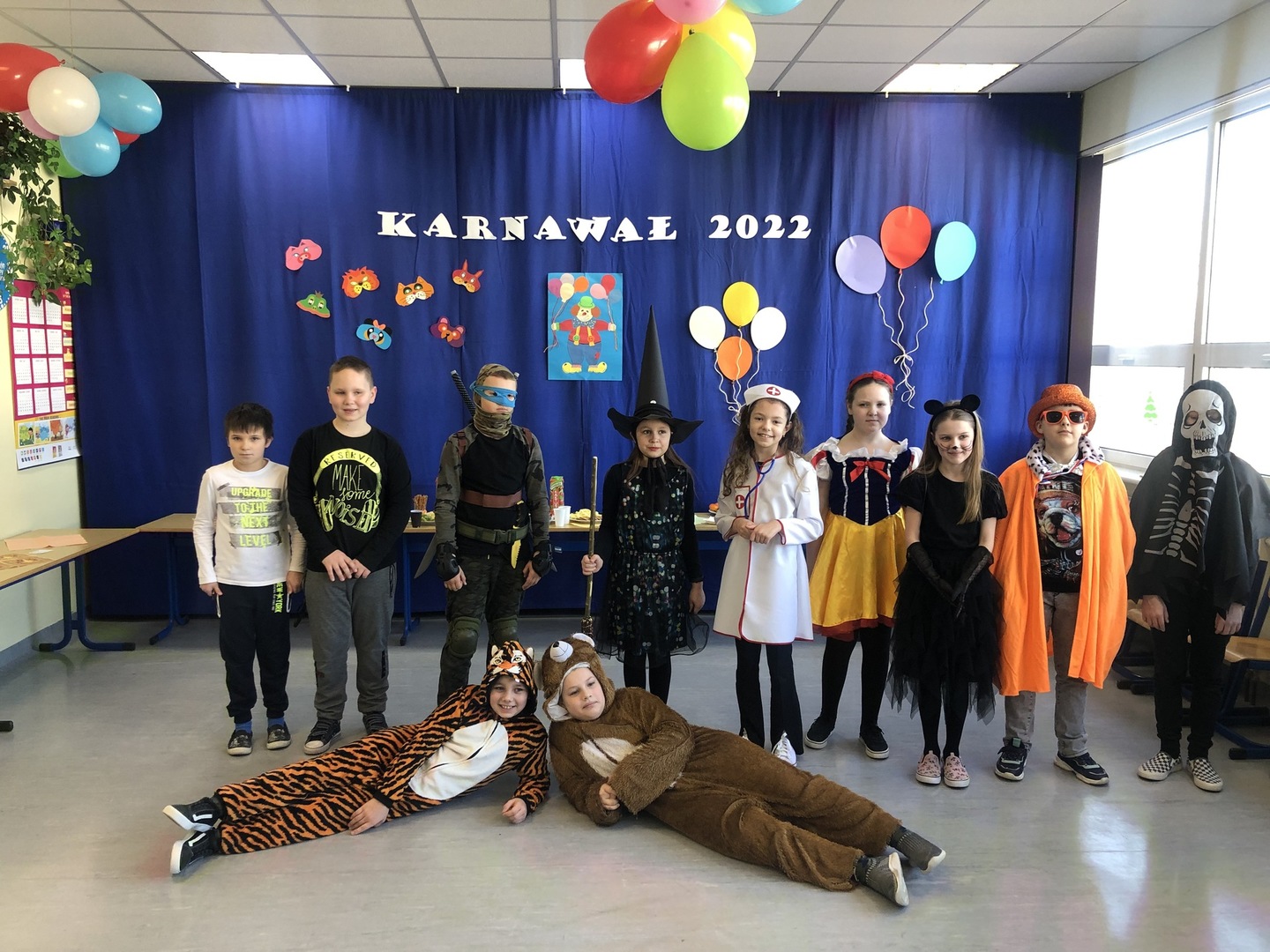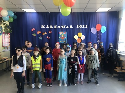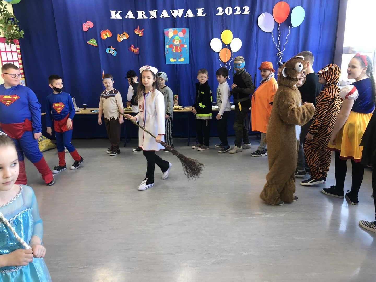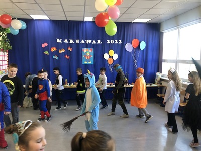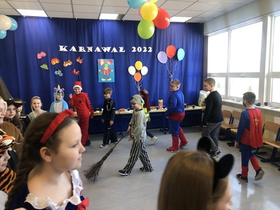 28 lutego 2022r w klasach I-III odbył się bal karnawałowy. Tego dnia w szkole pojawiły się kolorowe postacie. Wszyscy mieli piękne, pomysłowe przebrania - były więc księżniczki, wróżki, różne zwierzęta, piraci, superbohaterowie, postacie z bajek oraz przedstawiciele różnych zawodów. Dzieci tańczyły w rytm różnorodnej muzyki oraz brały udział w zabawach i konkursach. Dużo emocji dostarczył taniec z balonami, na gazetach, konkurs z krzesłami a także wędrująca przy dźwiękach muzyki miotła.Oczywiście nie zabrakło słodkiego poczęstunku.Wszyscy zgodnie przyznali, że to był udany bal.