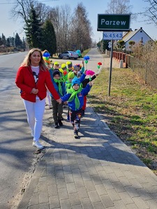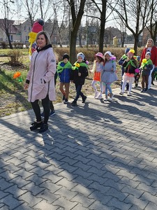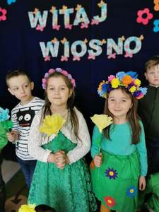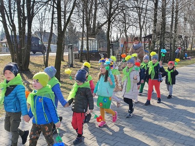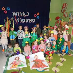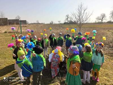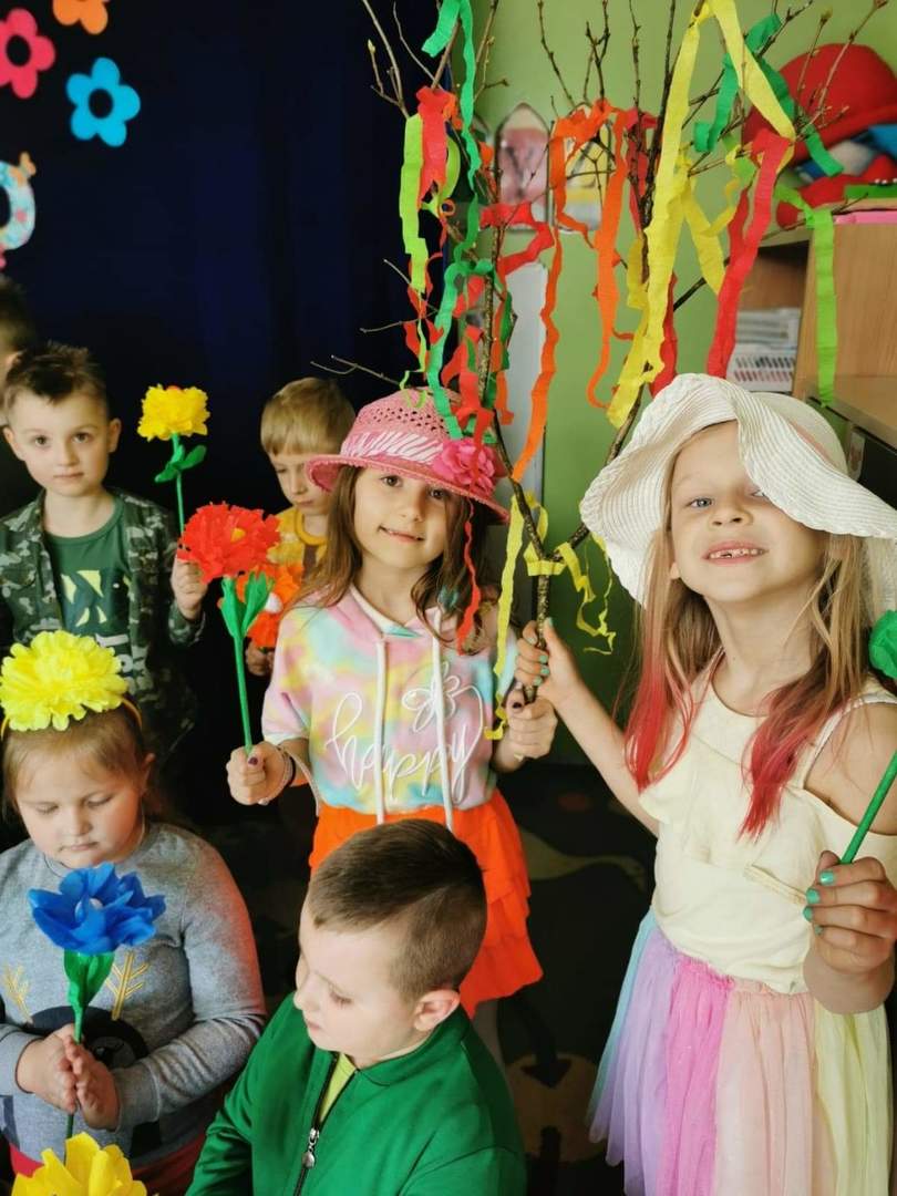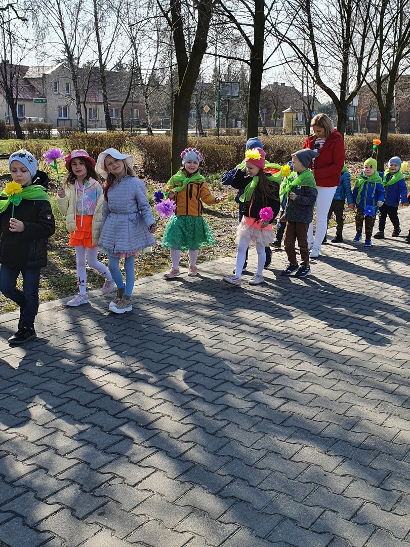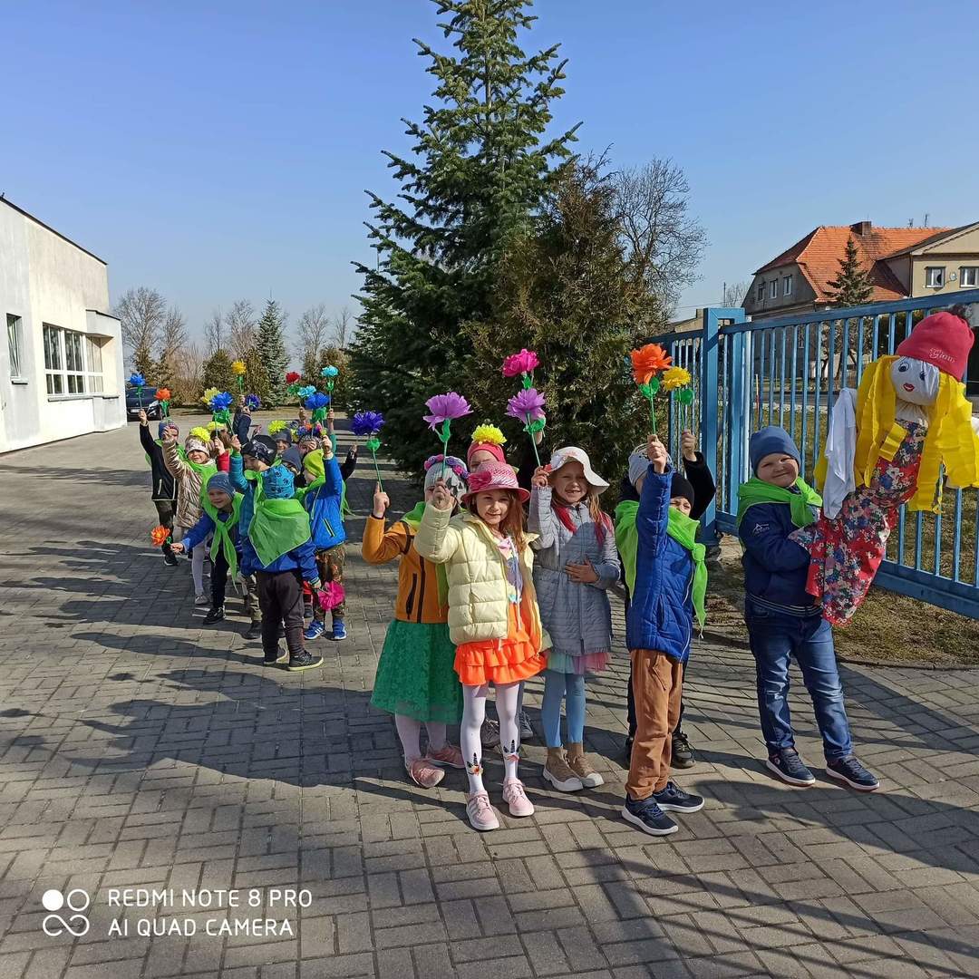 W piątek 25 marca dzieci z naszego przedszkola świętowały Pierwszy Dzień Wiosny. W tym dniu w strojach obowiązywały wiosenne barwy, a przede wszystkim kolor zielony. Dzieci piosenkami i zabawami przywitały najpiękniejszą porę roku – wiosnę. Nie zapomniały przy tym o uroczystym pożegnaniu zimy, której symbolem jest Marzanna .Wszystkie dzieci zebrały się pod przedszkolem, by wyruszyć barwnym korowodem ulicami wioski. Wiosenne słońce rozświetlało roześmiane twarze przedszkolaków. Na koniec dzieci namalowały portrety pani Wiosny.