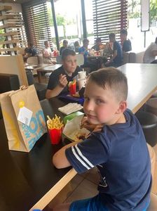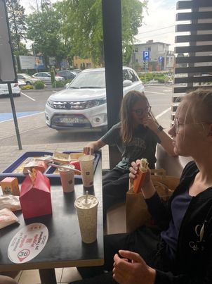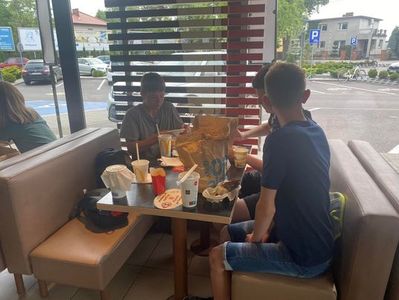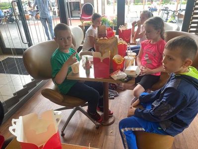 Po udanej zabawie w parku trampolin przyszedł czas na uzupełnienie straconych kalorii w popularnym lokalu z sieci barów szybkiej obsługi. Dzieci zjadły posiłek i ruszyły w drogę do domu.