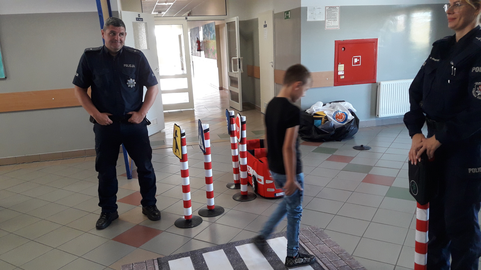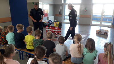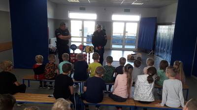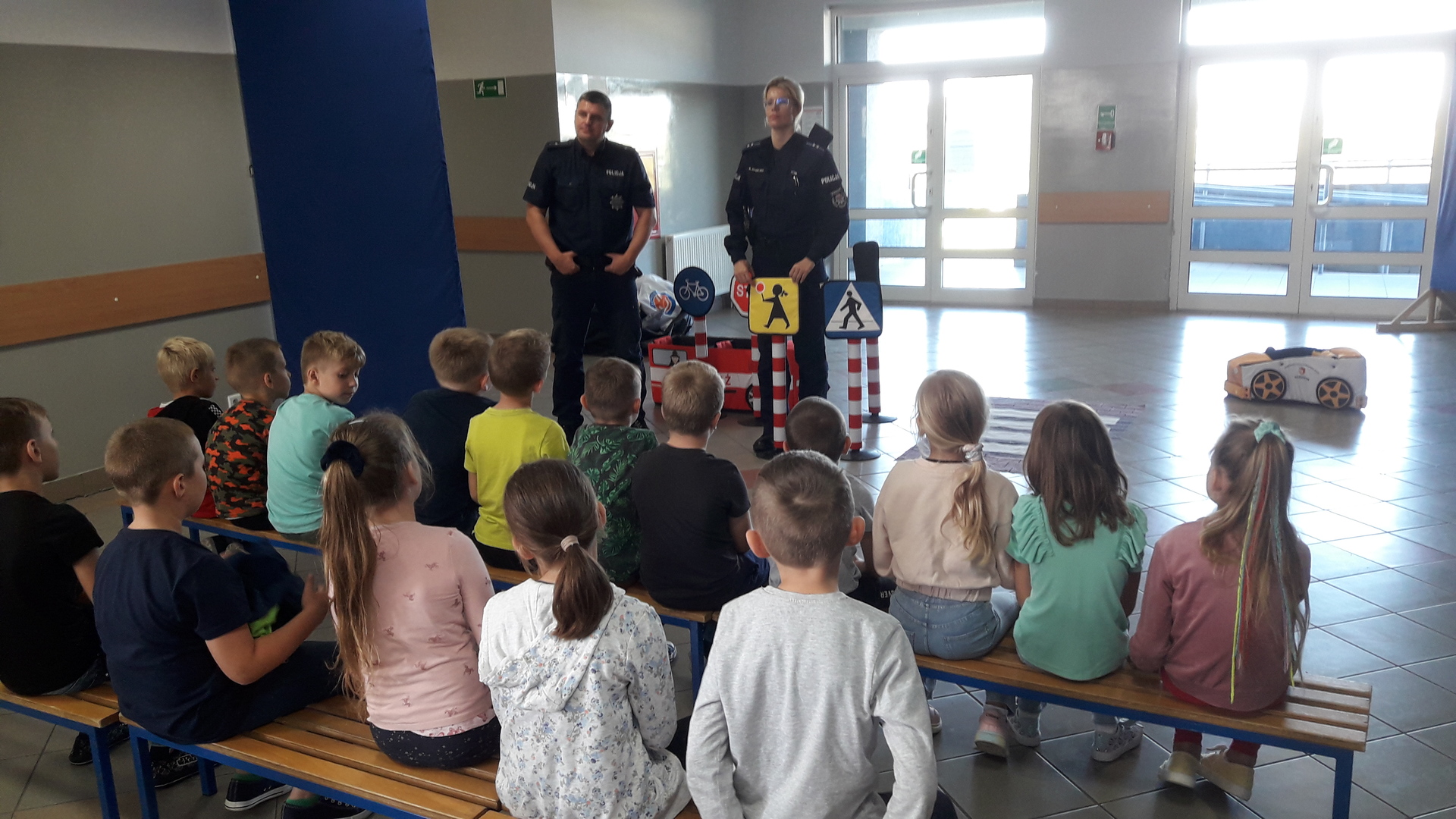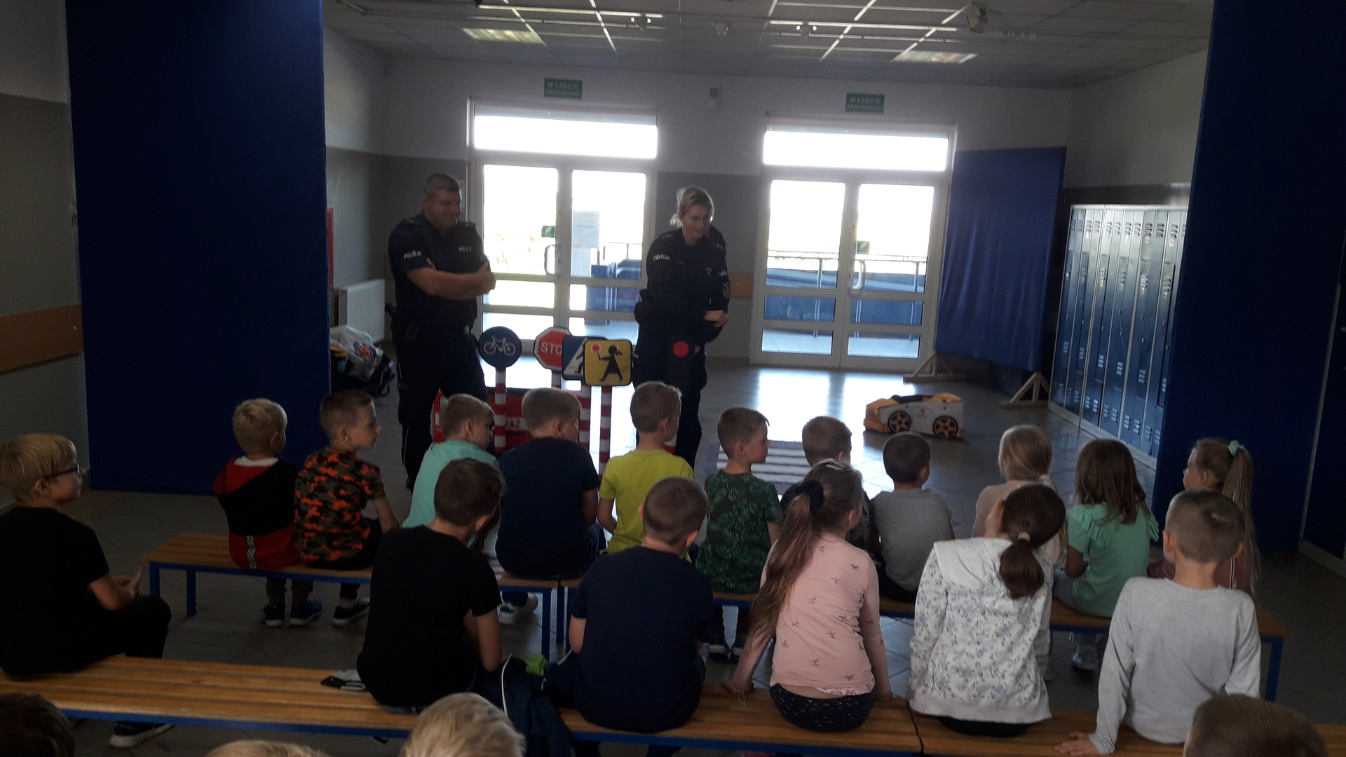 9 września uczniowie klas I- III spotkali się z policjantami: Dariuszem Barankiem z Zespołu Dzielnicowych w Kotlinie i Kariną Migalską- Cepą z Komendy Powiatowej Policji w Jarocinie. Głównym celem wizyty policjantów było omówienie z dziećmi kwestii bezpieczeństwa w ruchu drogowym. Uczniowie uważnie słuchali wypowiedzi i wskazówek gości, a później chętnie brali udział w ćwiczeniach.
