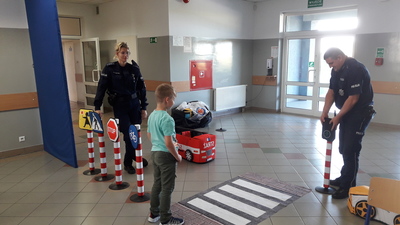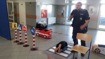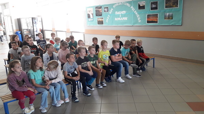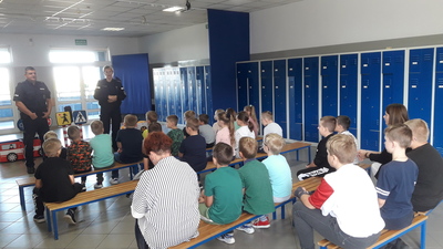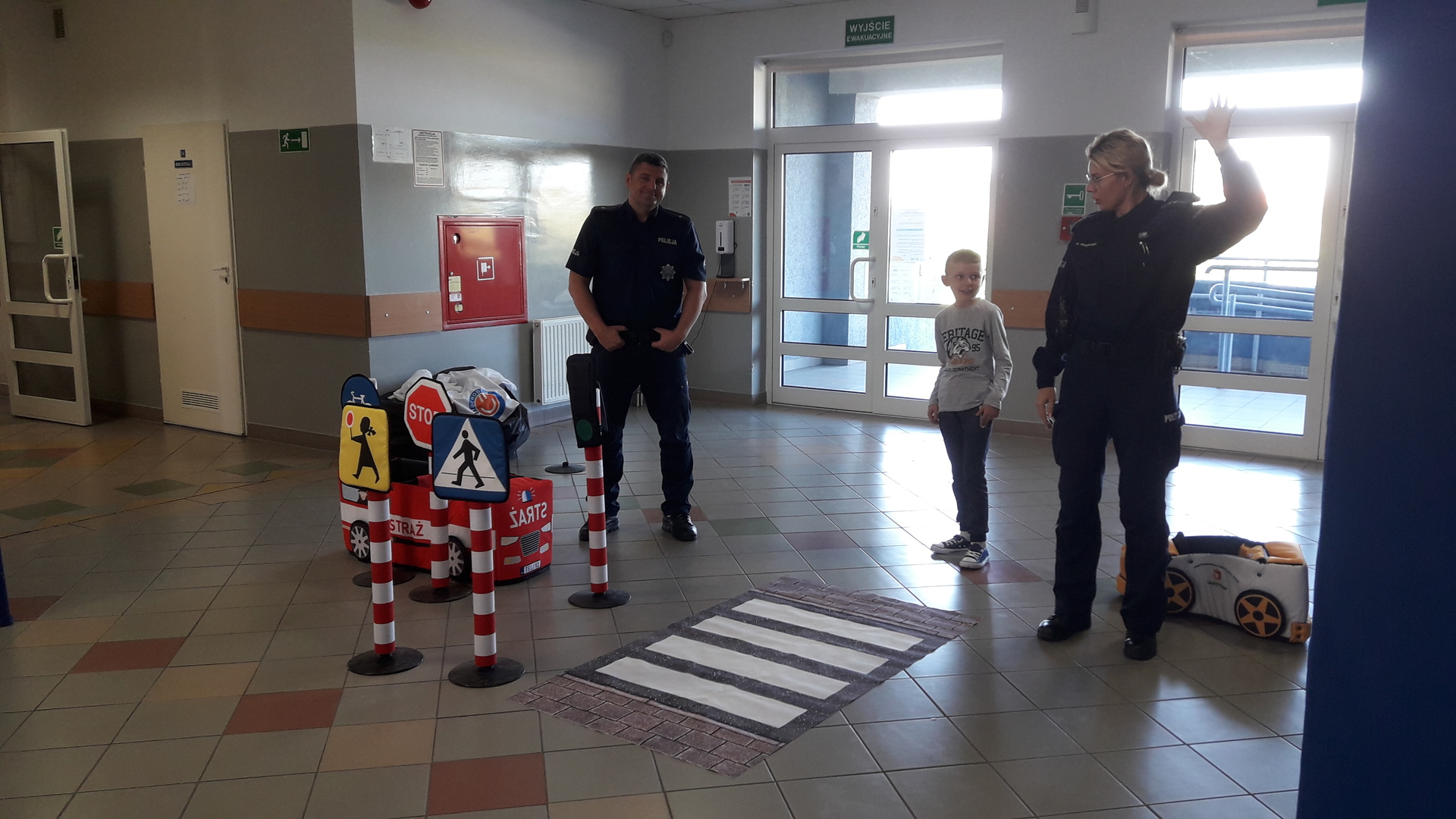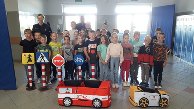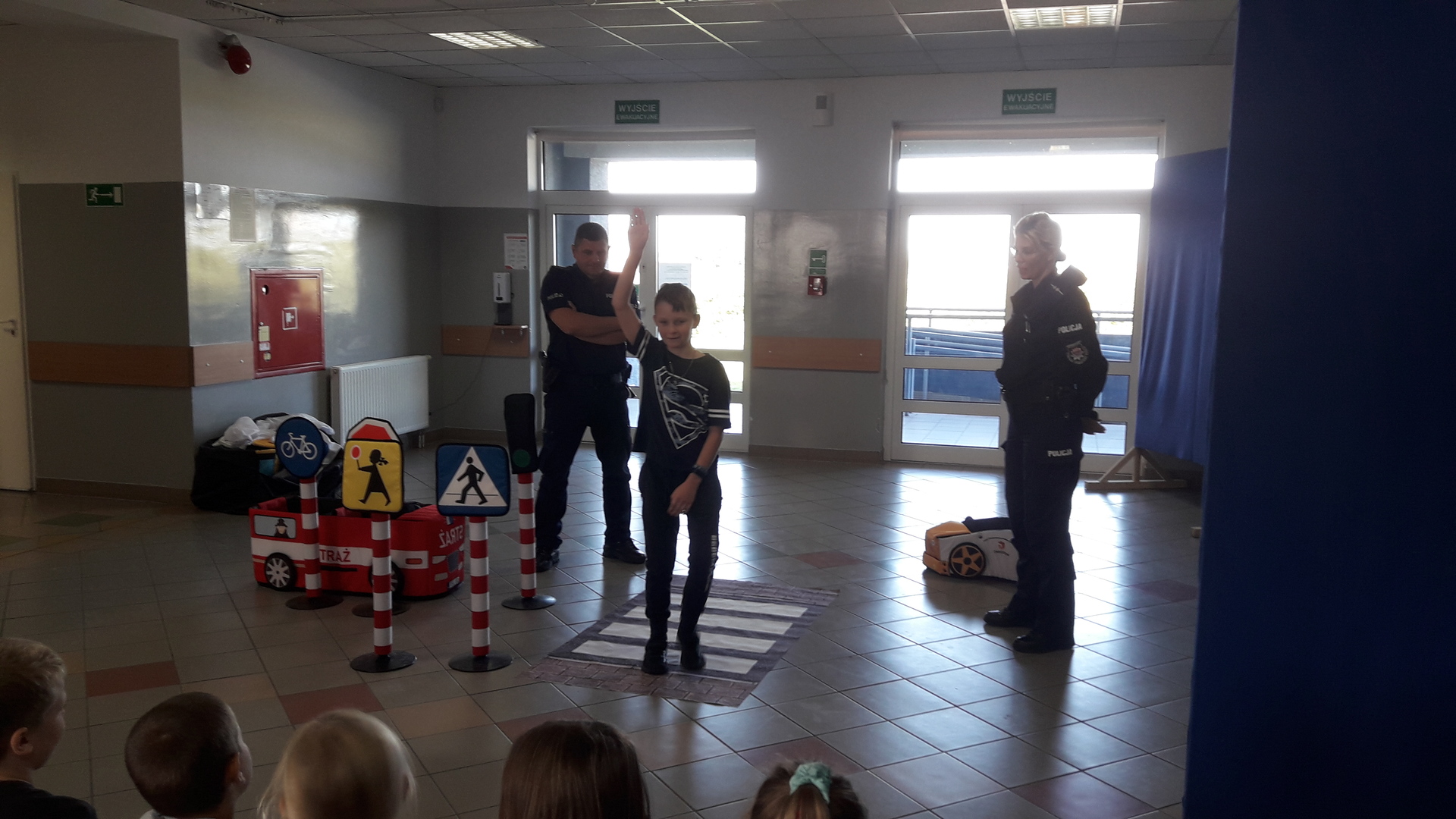 9 września uczniowie klas I- III spotkali się z policjantami: Dariuszem Barankiem z Zespołu Dzielnicowych w Kotlinie i Kariną Migalską- Cepą z Komendy Powiatowej Policji w Jarocinie. Głównym celem wizyty policjantów było omówienie z dziećmi kwestii bezpieczeństwa w ruchu drogowym. Uczniowie uważnie słuchali wypowiedzi i wskazówek gości, a później chętnie brali udział w ćwiczeniach.