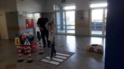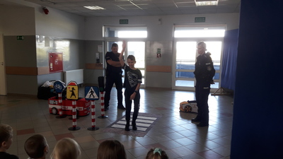 O czym zaś mówiono podczas spotkania? A więc: o zasadach bezpiecznego przechodzenia przez drogę, uważania na sygnalizację świetlną, komunikowania zamiaru przejścia przez ulicę zgodnie z zaleceniami akcji „Pomachaj kierowcy”. Policjanci tłumaczyli dzieciom konieczność korzystania z pasów bezpieczeństwa w samochodzie oraz zakładania kasku podczas rowerowych przejażdżek. Udzielili również wskazówek, jak się zachować w razie ataku psa. Dzieci chętnie odpowiadały na pytania policjantów i demonstrowały swoją wiedzę na temat bezpiecznego uczestnictwa w ruchu drogowym. Miejmy nadzieję, że utrwalenie posiadanych wiadomości będzie miało wpływ na właściwe zachowanie uczniów jako pieszych, rowerzystów i pasażerów.