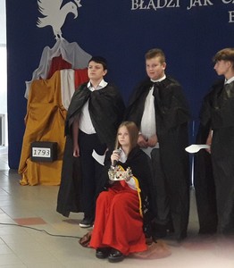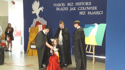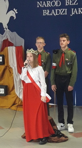 Uroczystość rozpoczęła się od wejścia naszego chorążego i asysty ze sztandarem szkoły i odśpiewania hymnu narodowego. Następnie ósmoklasiści w przystępnej formie przedstawili dzieje naszej Ojczyzny od czasów zaborów do roku 1918. Wykorzystali wiele rekwizytów, dzięki którym przekaz płynący z wypowiedzi aktorów i narratorów lepiej trafił do świadomości naszej młodej widowni. Widzieliśmy więc mapę przedstawiającą dawną Rzeczpospolitą, z której co chwilę znikały wielkie obszary zabierane przez bezwzględnych zaborców. Wcielający się w nich uczniowie wystąpili w czarnych pelerynach nawiązujących do mrocznego czasu niewoli. W centrum sceny siedziała zaś ósmoklasistka będąca uosobieniem Polski. Za sprawą zaborców straciła koronę – symbol swojej godności. Jednak dzięki poświęceniu polskiego społeczeństwa, o którym opowiedzieli narratorzy, nasza Ojczyzna odzyskała swą niezależność i wróciła na mapę Europy.