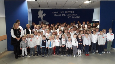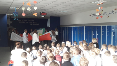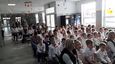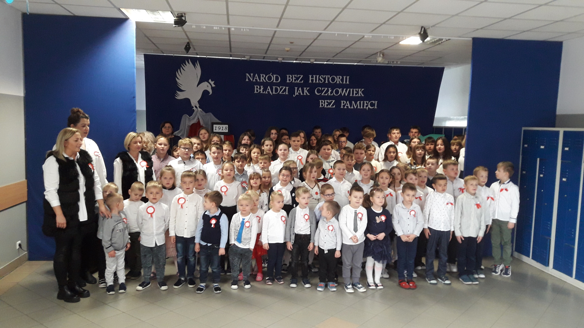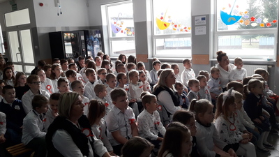 Następnie cała szkolna społeczność jeszcze raz odśpiewała „Mazurka Dąbrowskiego”. Byliśmy dumni z uczniów, którzy stosownymi, ozdobionym biało-czerwonymi rozetkami strojami i donośnym śpiewem uczcili nasze piękne narodowe święto.