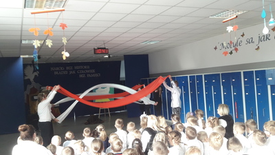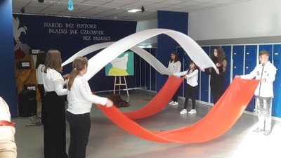 Oprócz spektaklu VIII klasy uznanie zyskał finał apelu, czyli taniec z flagami. Członkowie kółka teatralnego przedstawili niesamowity układ choreograficzny – taniec z szarfami w naszych barwach narodowych. Występ, który wymagał od wykonawców uważności i synchronizacji ruchów, bardzo podobał się publiczności.