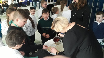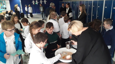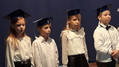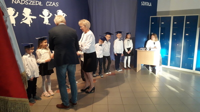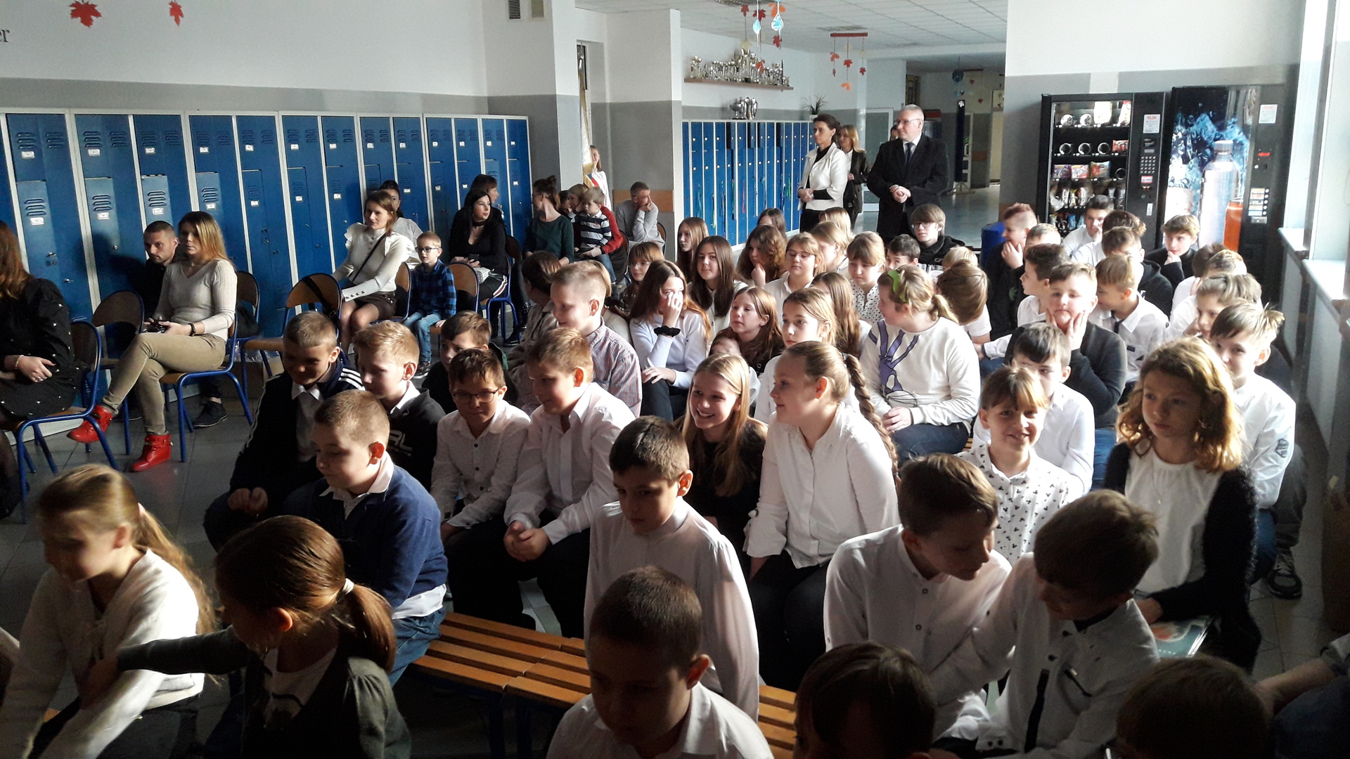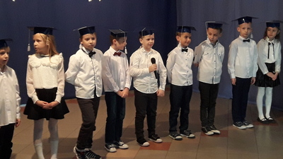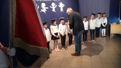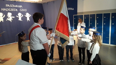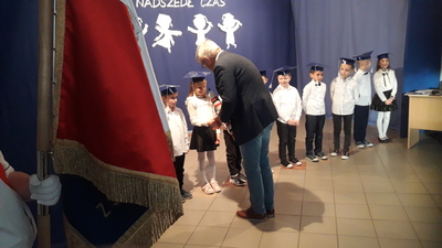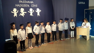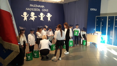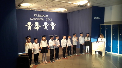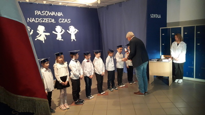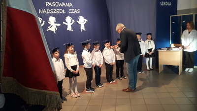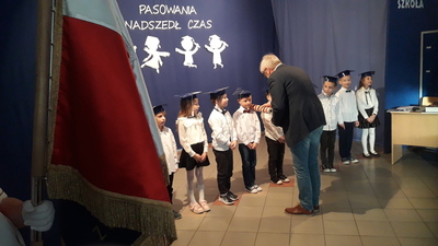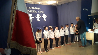 A co się działo u pierwszaków? Otóż dla nich również był to szczególny dzień. Pod kierunkiem swojej wychowawczyni – Doroty Będziechy przygotowali wesoły występ z okazji swojego pasowania na uczniów naszej szkoły. Pierwszoklasiści pomyślnie zdali egzamin z wiedzy o szkole, co stało się przepustką do przyjęcia ich do szkolnej społeczności. W związku z tym złożyli oni ślubowanie na sztandar szkoły, po czym zostali pasowani wielkim ołówkiem przez dyrektora szkoły, Romana Stoleckiego.