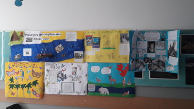 Rano klasy II- VIII przygotowały plakaty odwołujące się do twórczości naszego Patrona. Powstały piękne prace nawiązujące do książek Fiedlera, w tym m.in. niezwykła prezentacja w 3D stworzona przez kl. VI i przyciągający uwagę lapbook autorstwa dzieci z klas II-III. Po wykonaniu prac plastycznych uczniowie zgromadzili się w „szkolnym kinie”, gdzie obejrzeli film dokumentalny o Arkadym Fiedlerze.