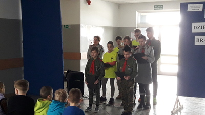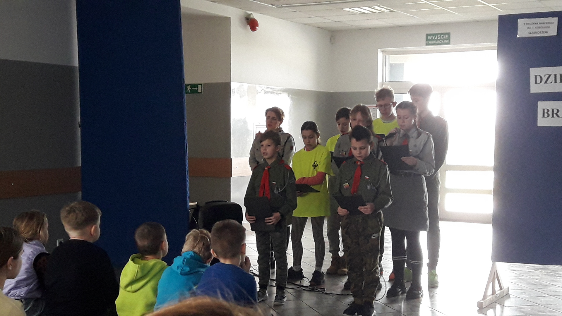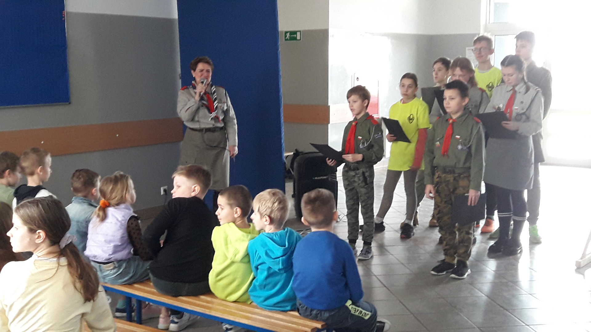 Nasi harcerze przedstawili zebranym na holu uczniom i nauczycielom postać tego zasłużonego człowieka. Zaśpiewali również piosenkę pt. „Harcerskie ideały”.