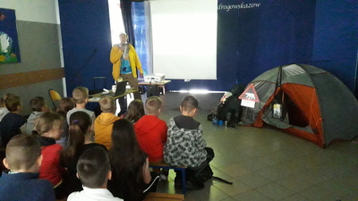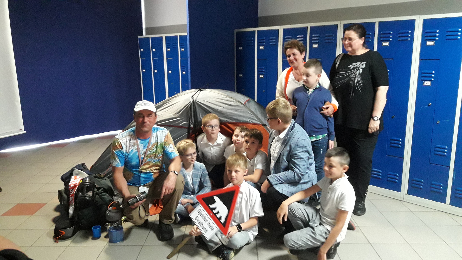Podróżnik przywiózł ze sobą swój ekwipunek: namiot i potrzebne podczas wyprawy akcesoria. Młodsi uczniowie skorzystali z okazji, by przykucnąć przed namiotem i zrobić sobie z panem Adamem pamiątkowe zdjęcie.