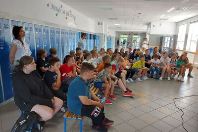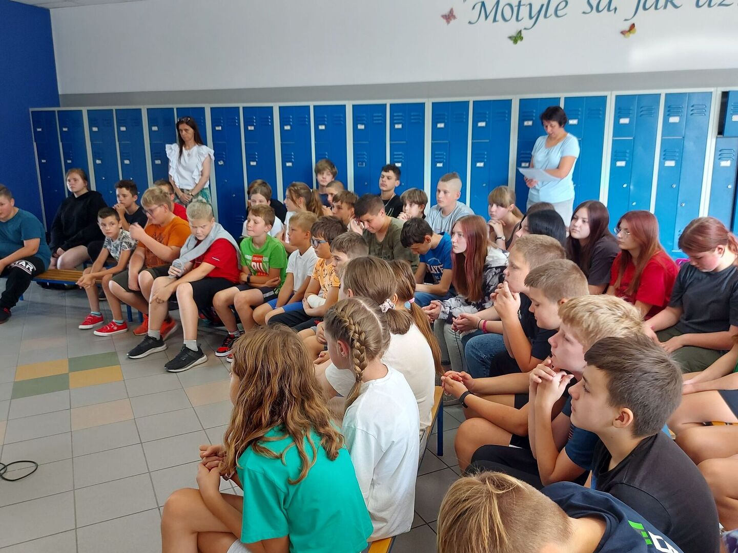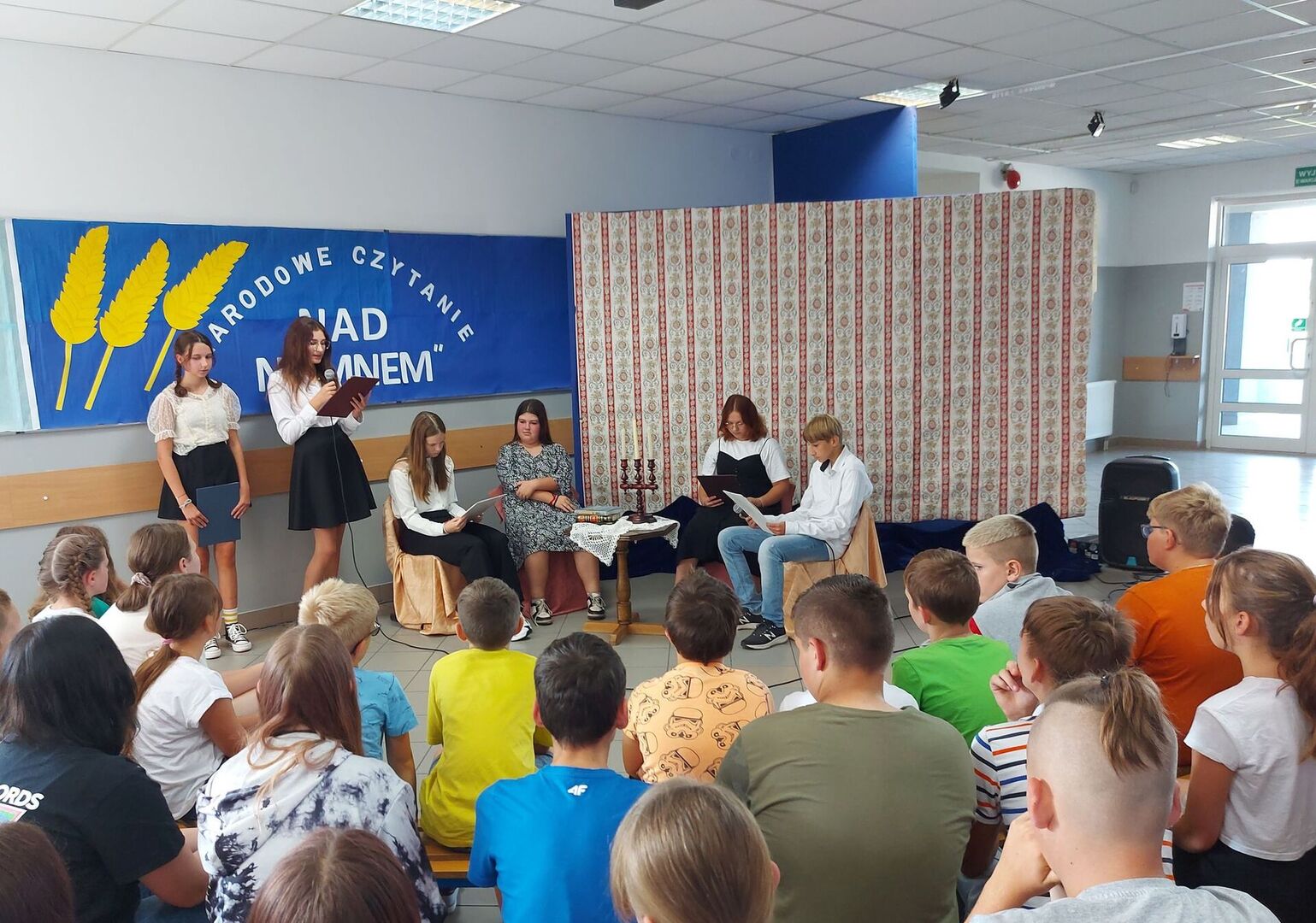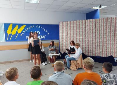 11 września na naszym holu zasiedli więc uczniowie klas IV-VIII, by wysłuchać kilku istotnych informacji o pozytywizmie w Polsce, a chwilę później - fragmentów poruszającej powieści o polskim społeczeństwie zmagającym się z trudnymi realiami, które nastały po upadku Powstania Styczniowego. Jednak jest to też książka o nadziei na odrodzenie narodu, a nadzieję tę dają decyzje młodych bohaterów „Nad Niemnem” czyli Justyny Orzelskiej, Jana Bohatyrowicza i Witolda Korczyńskiego. Imiona Justyny i Janka pojawiły się zresztą we fragmencie, który wspólnie odczytali uczniowie klasy VI i VIII. Bardzo dobrze wcielili się w role, w swojej interpretacji oddali usposobienie przydzielonych im postaci oraz sielski nastrój nadniemeńskiej wsi.