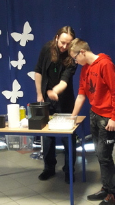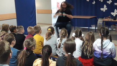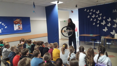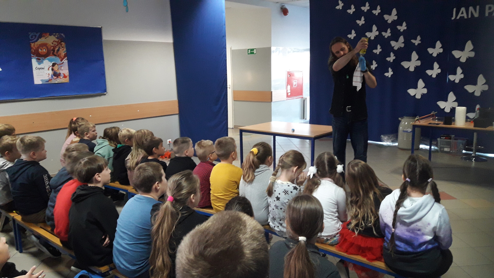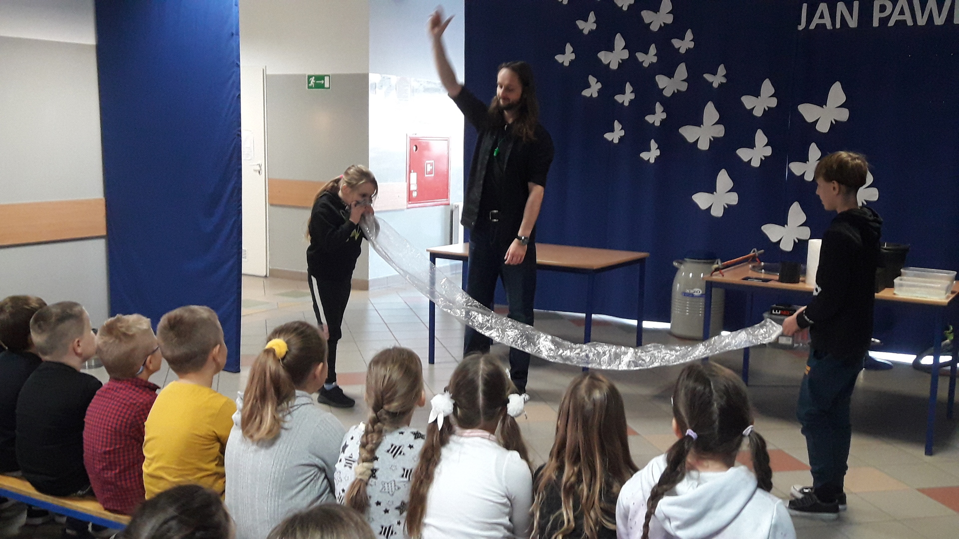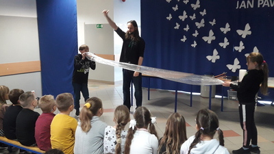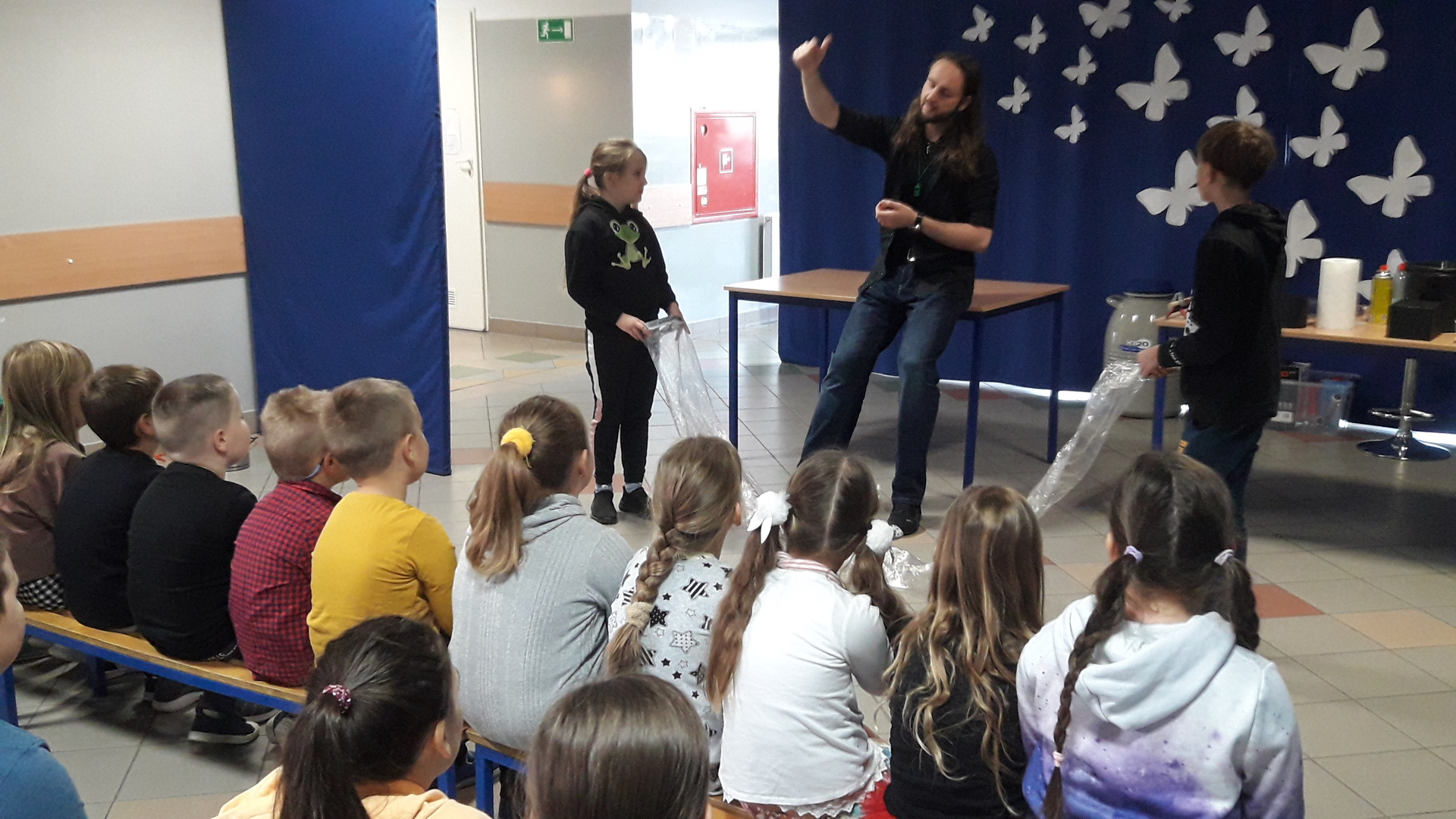 18 października nasi uczniowie mieli okazję obserwować niezwykłe eksperymenty z dziedziny fizyki i chemii. Przewodnikiem po świecie nauki był znany już dzieciom i młodzieży p. Mateusz Łucki z firmy EduEvent. Podczas swojej wizyty przeprowadził wiele ciekawych doświadczeń z zastosowaniem ciekłego azotu, łatwopalnych gazów, magnesów i nadprzewodników. Tak jak w poprzednich latach, nie brakowało ochotników chcących asystować przy eksperymentach albo nawet być obiektem naukowych testów. Ci, którzy zostali wybrani przez pana Mateusza, przeżyli niezapomnianą przygodę. Ich koleżanki i koledzy niejeden raz wstrzymywali oddech z wrażenia, obserwując poczynania „asystentów”.
