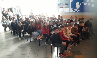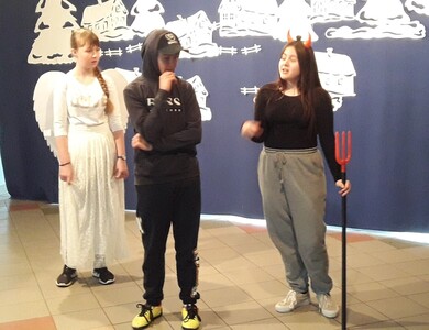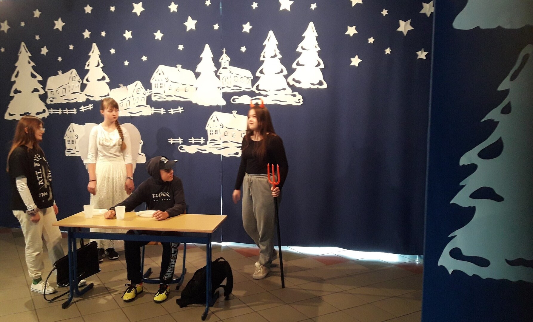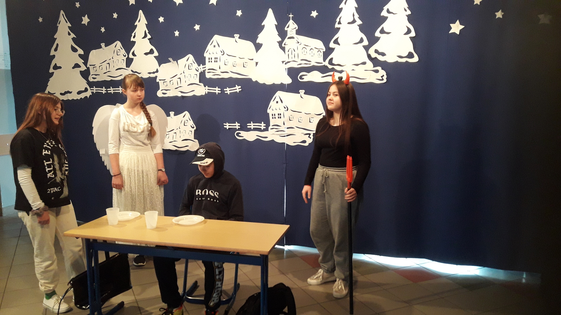 12 grudnia nasi siódmoklasiści wystąpili na szkolnym holu w przedstawieniu, które wcześniej zaprezentowali podczas IX Gminnego Konkursu Sztuk Teatralno – Profilaktycznych. Tym razem jego odbiorcami byli uczniowie i nauczyciele naszej szkoły.