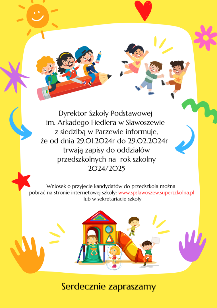 Dyrektor Szkoły Podstawowej im. Arkadego Fiedlera w Sławoszewie z siedzibą w Parzewie informuje, że od dnia 29.01.2024r. - 29.02.2024r. trwają zapisy do oddziałów przedszkolnych na rok szkolny 2024/2025. Wniosek o przyjęcie kandydatów można pobrać na stronie internetowej szkoły lub w sekretariacie.