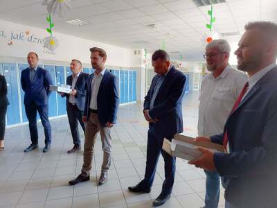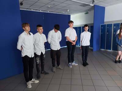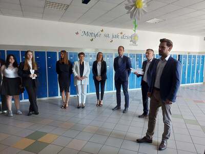 Nasi uczniowie zmierzą się z zadaniami z języków obcych. Dziś życzenia powodzenia złożono w szerszym gronie, ponieważ w "odprawie" na holu uczestniczyli również goście - Wójt naszej gminy - Paweł Wyremblewski oraz Przewodniczący Rady Gminy - Dariusz Walczak.