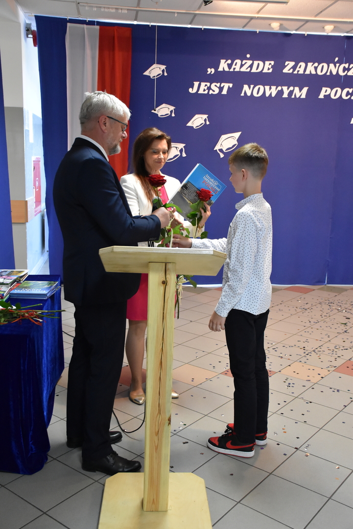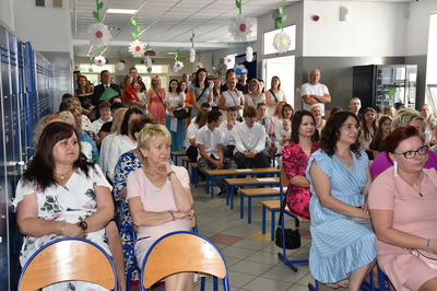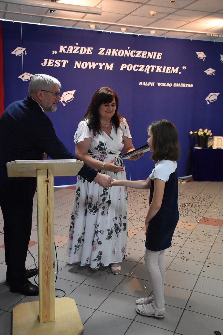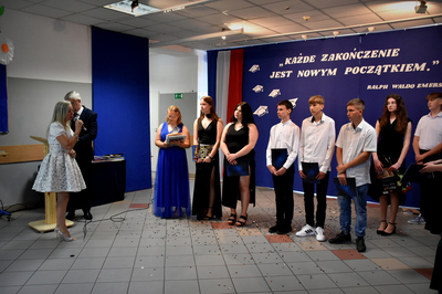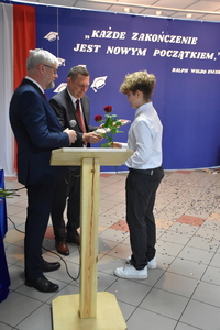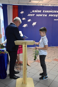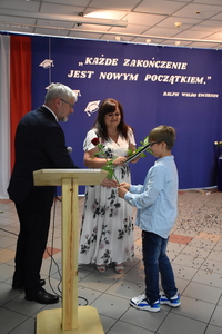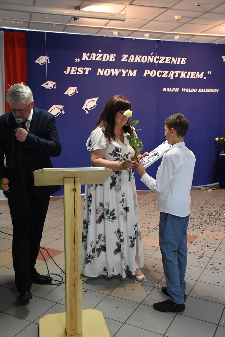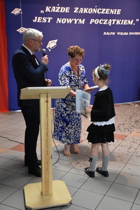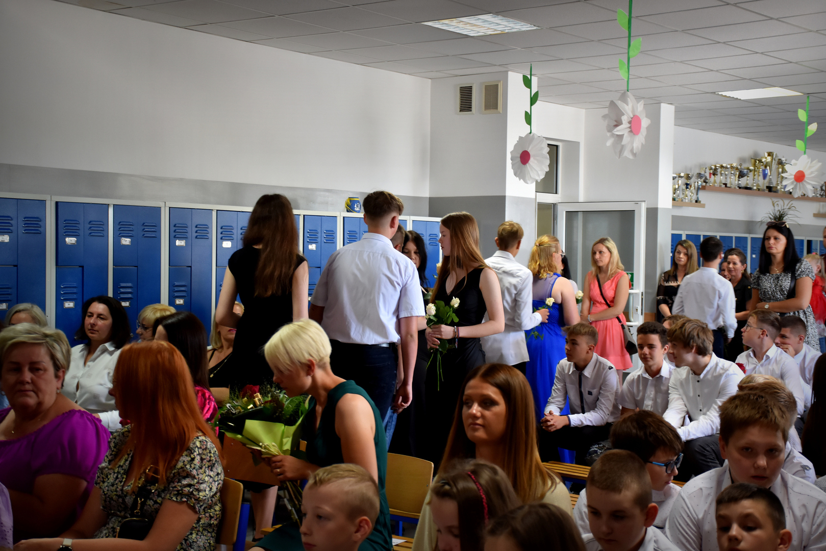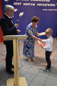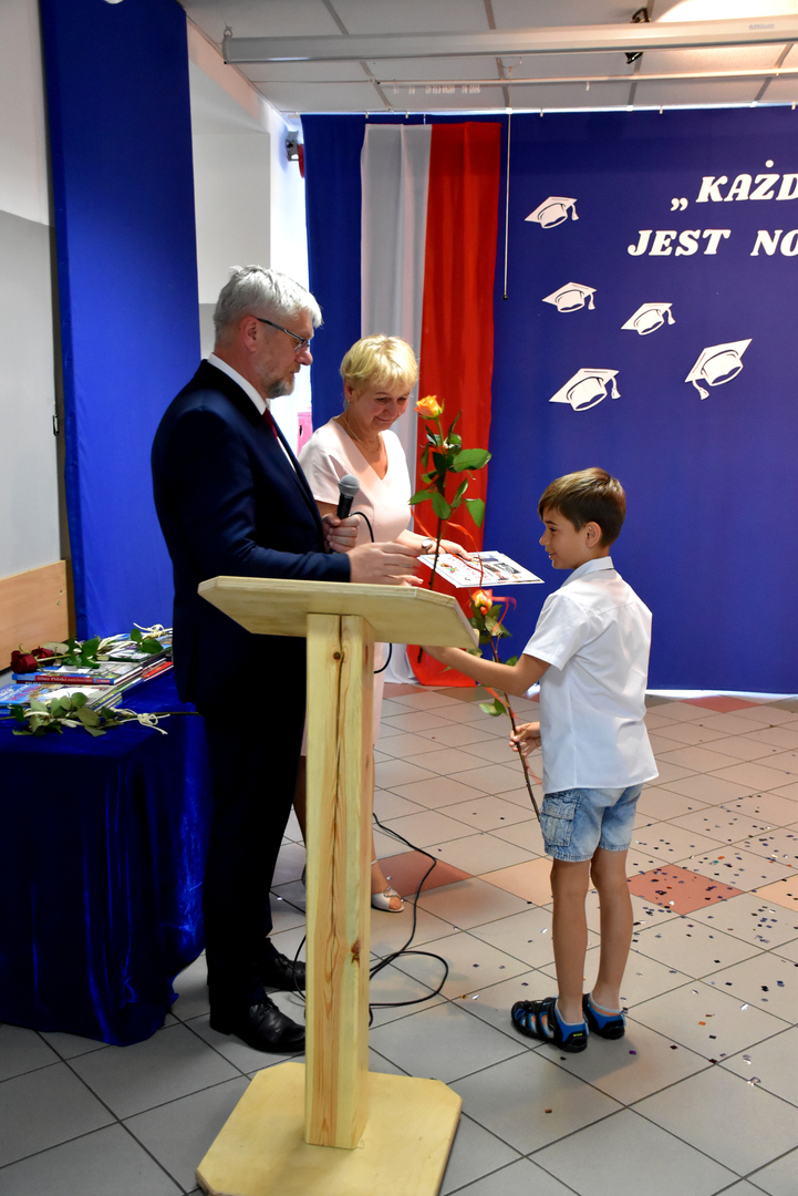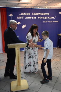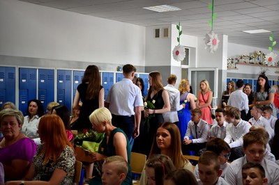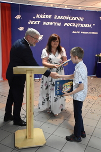 Po występie ósmoklasistów nadszedł czas na wręczenie świadectw z wyróżnieniem uczniom klas I-VII. Wszyscy, którzy w bieżącym roku szkolnym wypracowali odpowiednio wysoką średnią i otrzymali równie wysoką ocenę z zachowania, energicznym krokiem wychodzili na środek holu i z radością odbierali wyróżnienia.