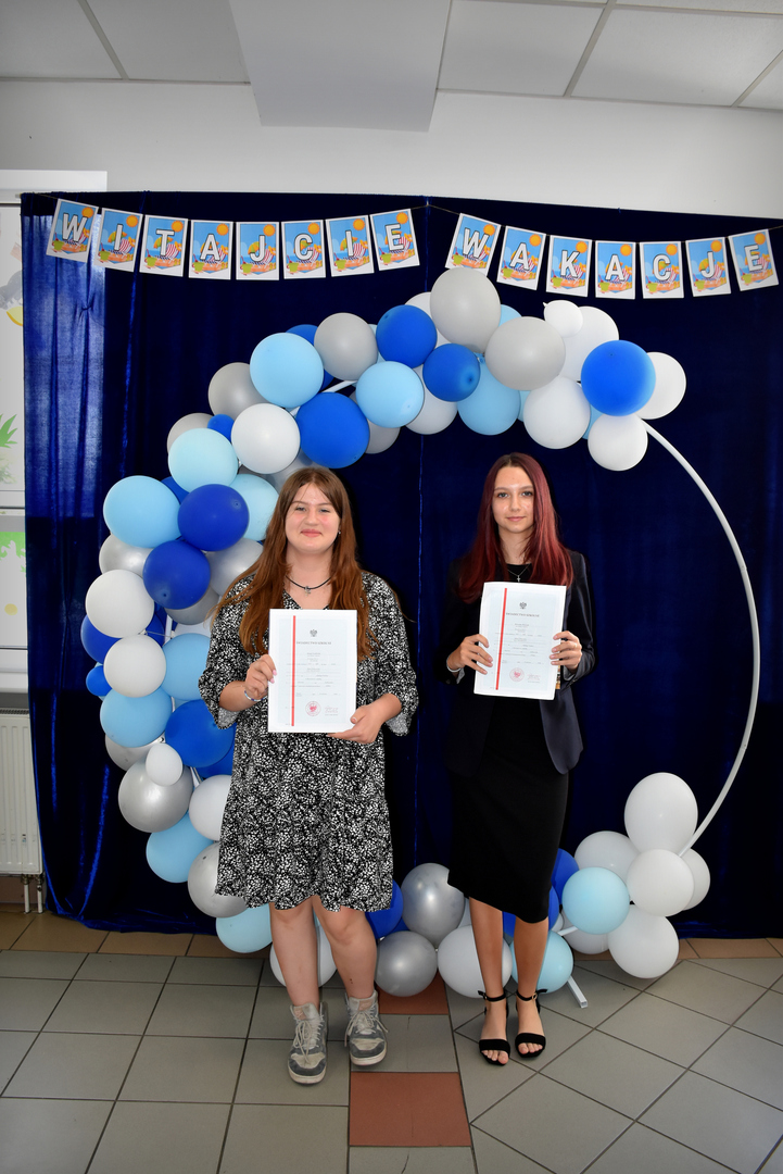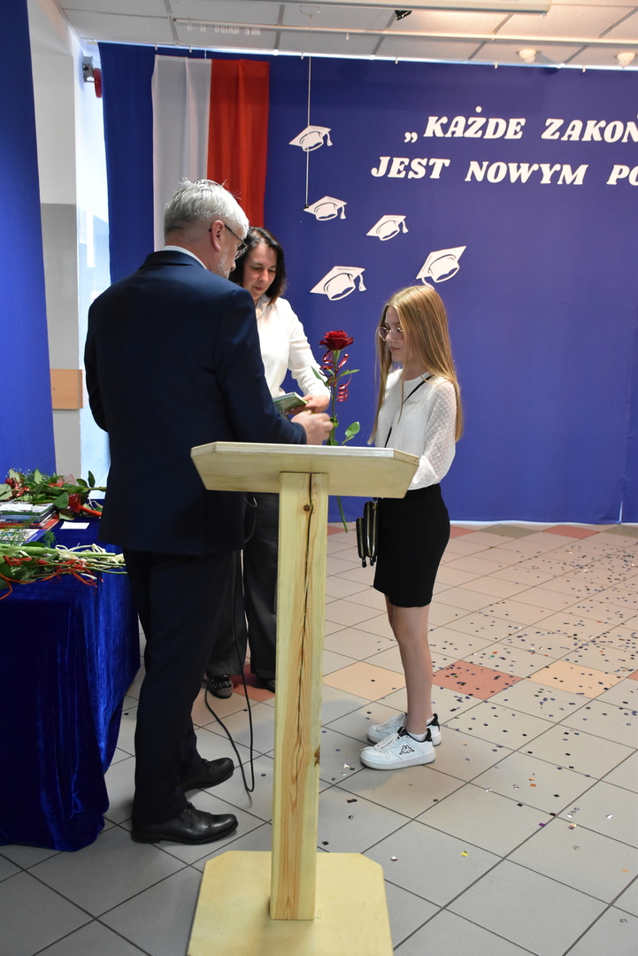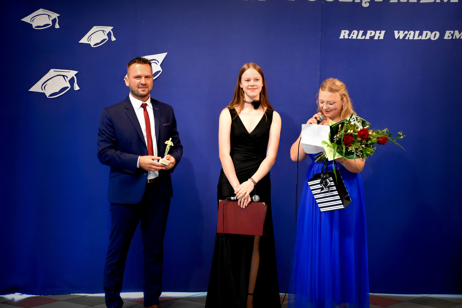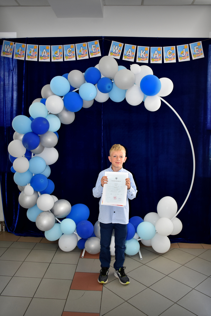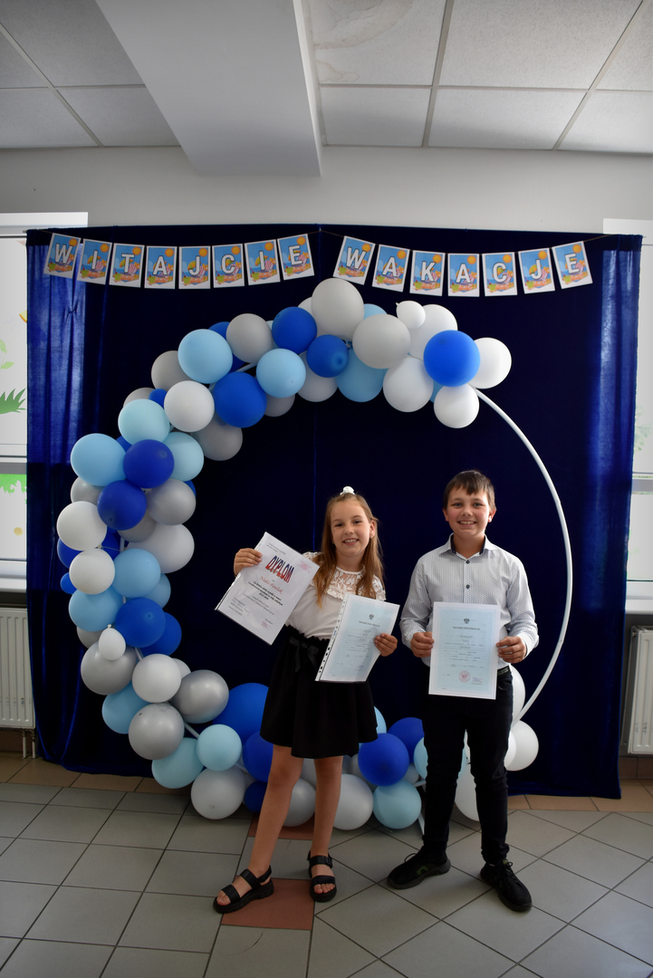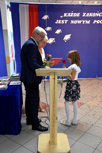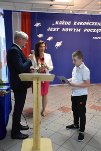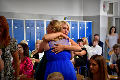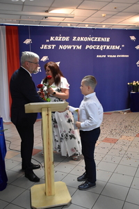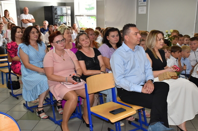 Po występie ósmoklasistów nadszedł czas na wręczenie świadectw z wyróżnieniem uczniom klas I-VII. Wszyscy, którzy w bieżącym roku szkolnym wypracowali odpowiednio wysoką średnią i otrzymali równie wysoką ocenę z zachowania, energicznym krokiem wychodzili na środek holu i z radością odbierali wyróżnienia.