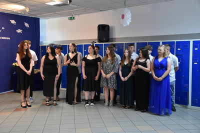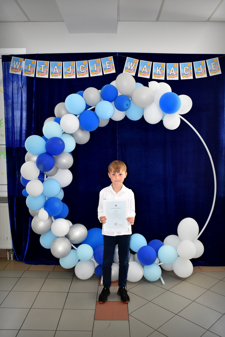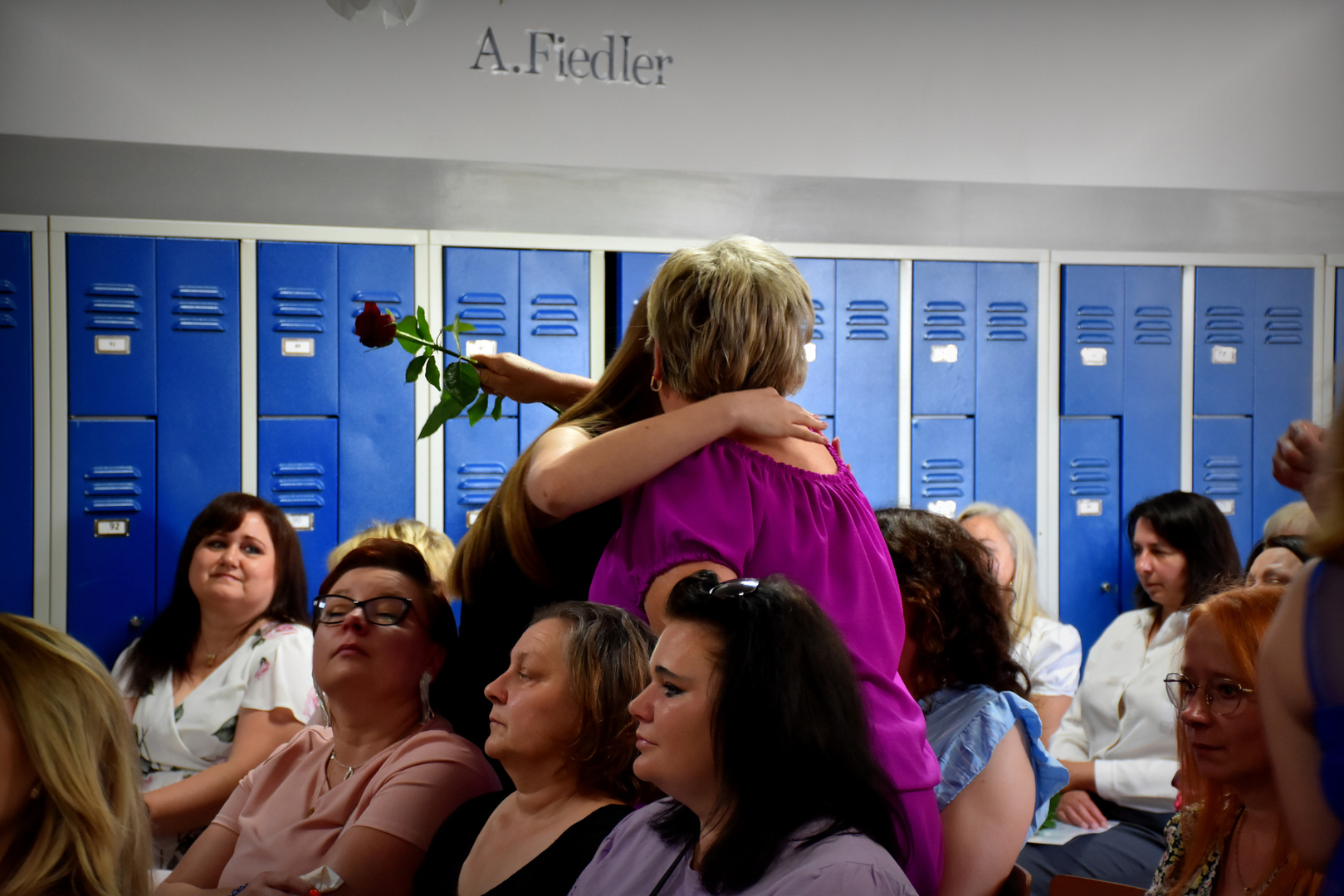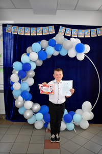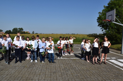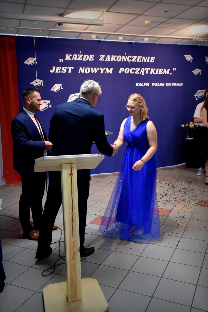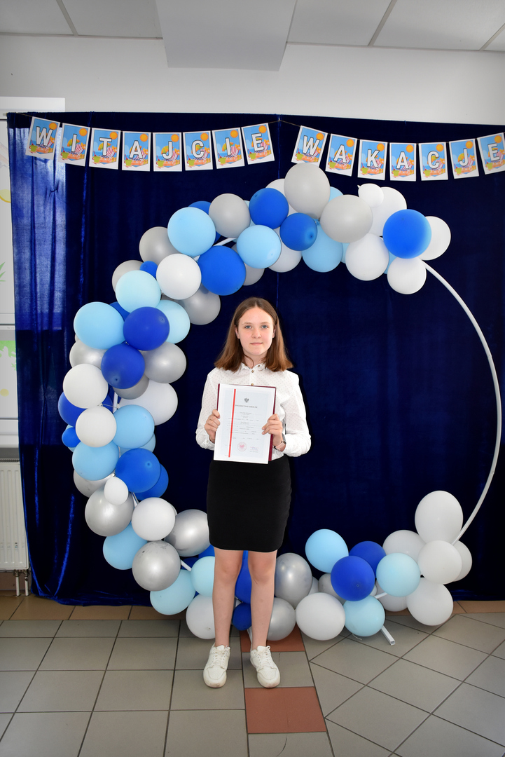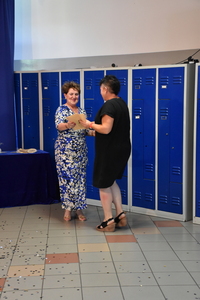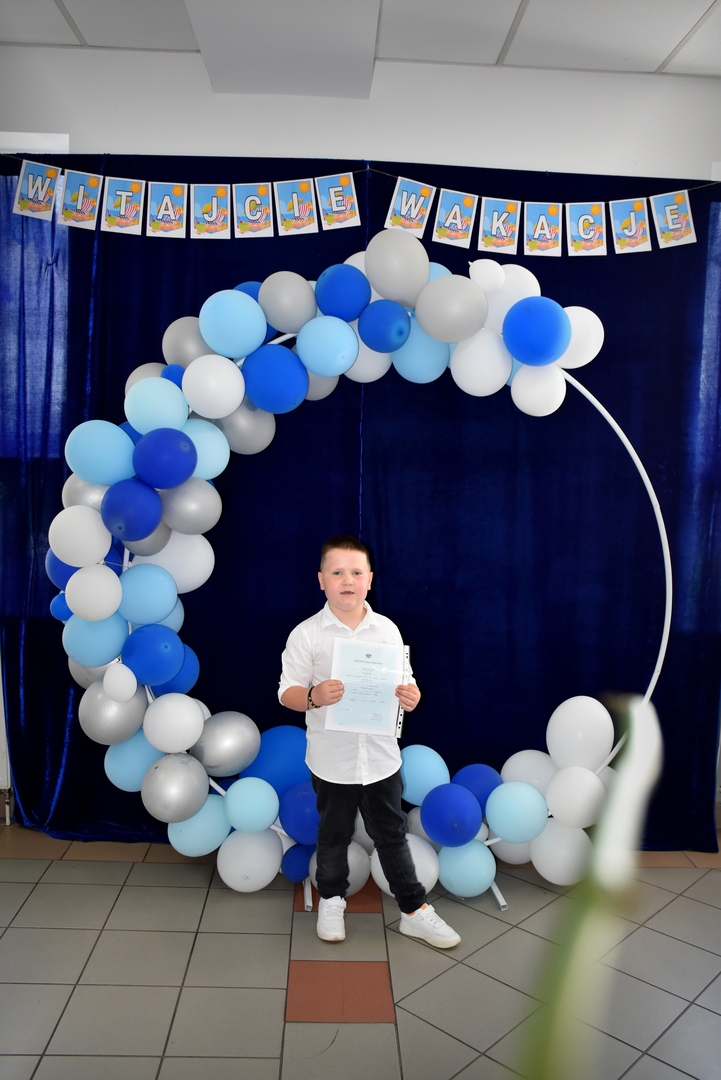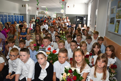 Po występie ósmoklasistów nadszedł czas na wręczenie świadectw z wyróżnieniem uczniom klas I-VII. Wszyscy, którzy w bieżącym roku szkolnym wypracowali odpowiednio wysoką średnią i otrzymali równie wysoką ocenę z zachowania, energicznym krokiem wychodzili na środek holu i z radością odbierali wyróżnienia.