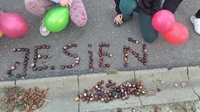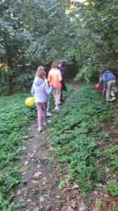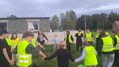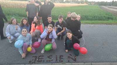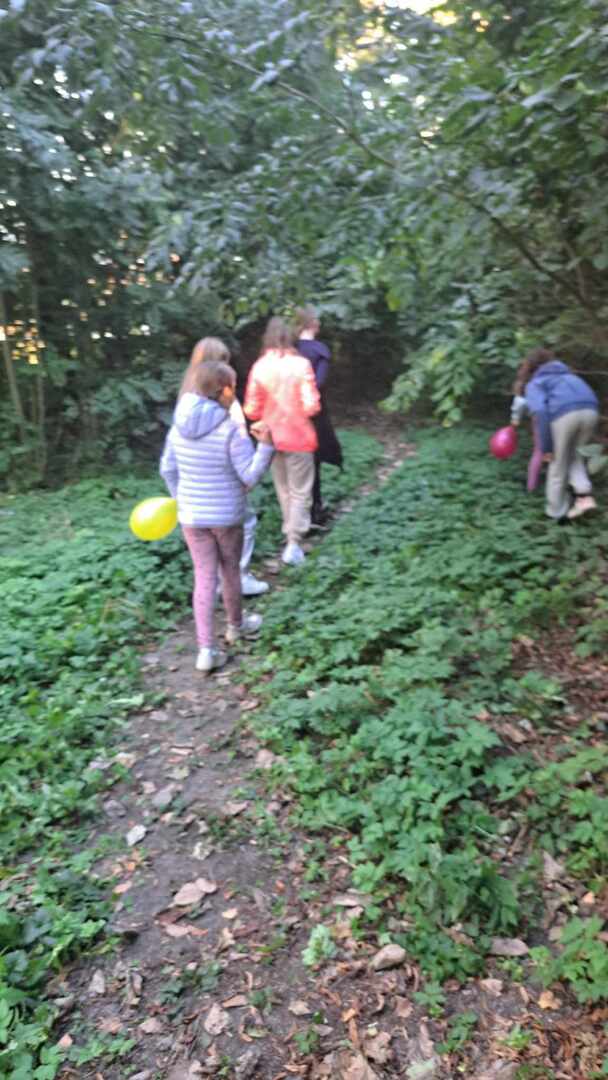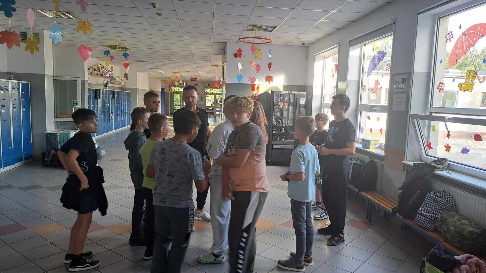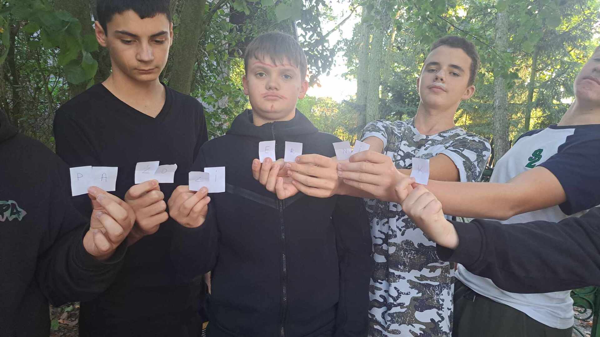 Na początek gra terenowa „Podchody” – w której uczniowie mierzyli się z różnorodnymi zadaniami z tematem jesieni w tle, m.in. układanie hasła z literek, zbieranie ziemniaków, śpiewanie piosenek, spacer z kolegą lub koleżanką w butach z powiązanymi sznurowadłami.