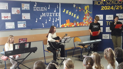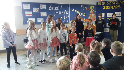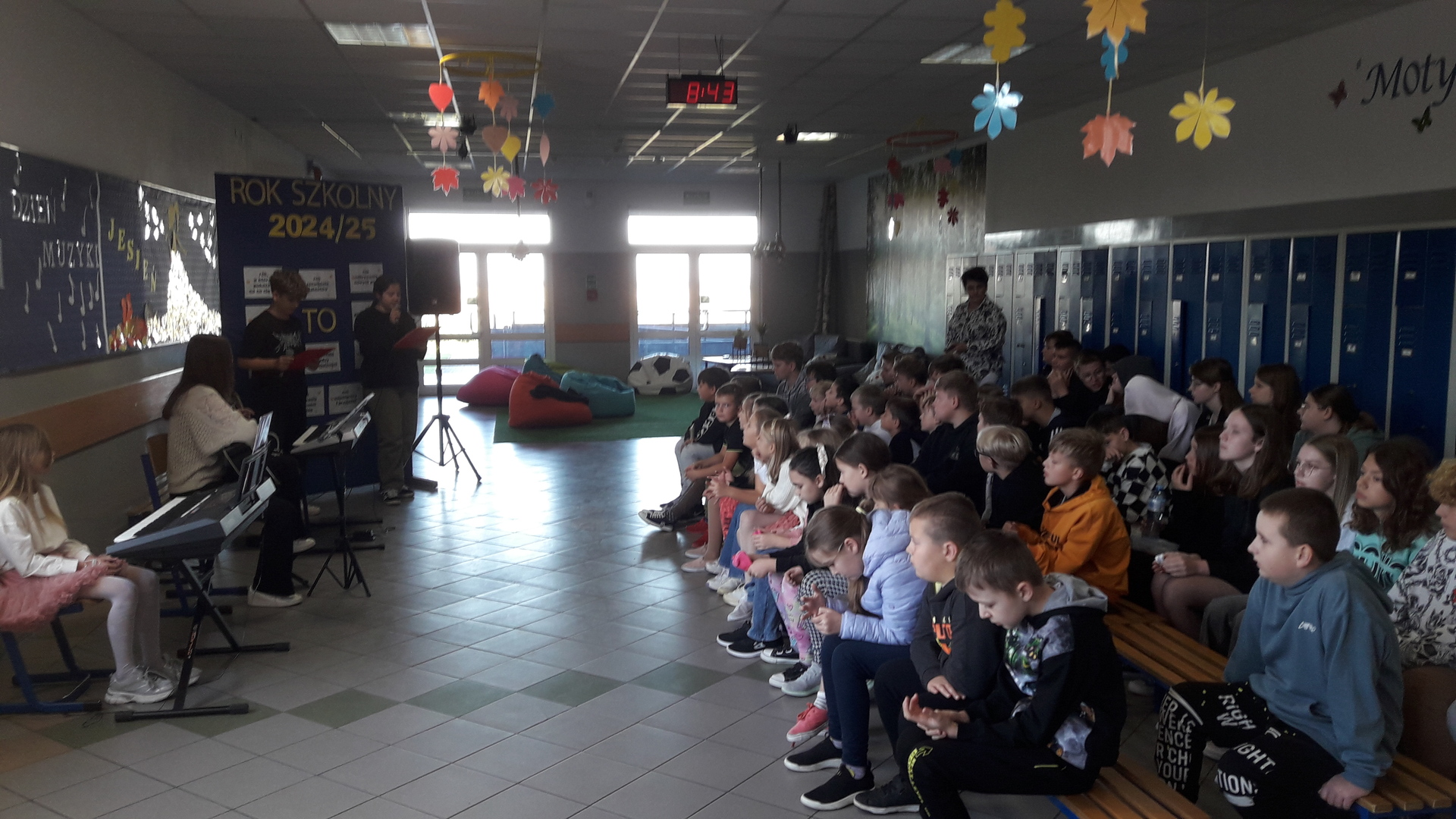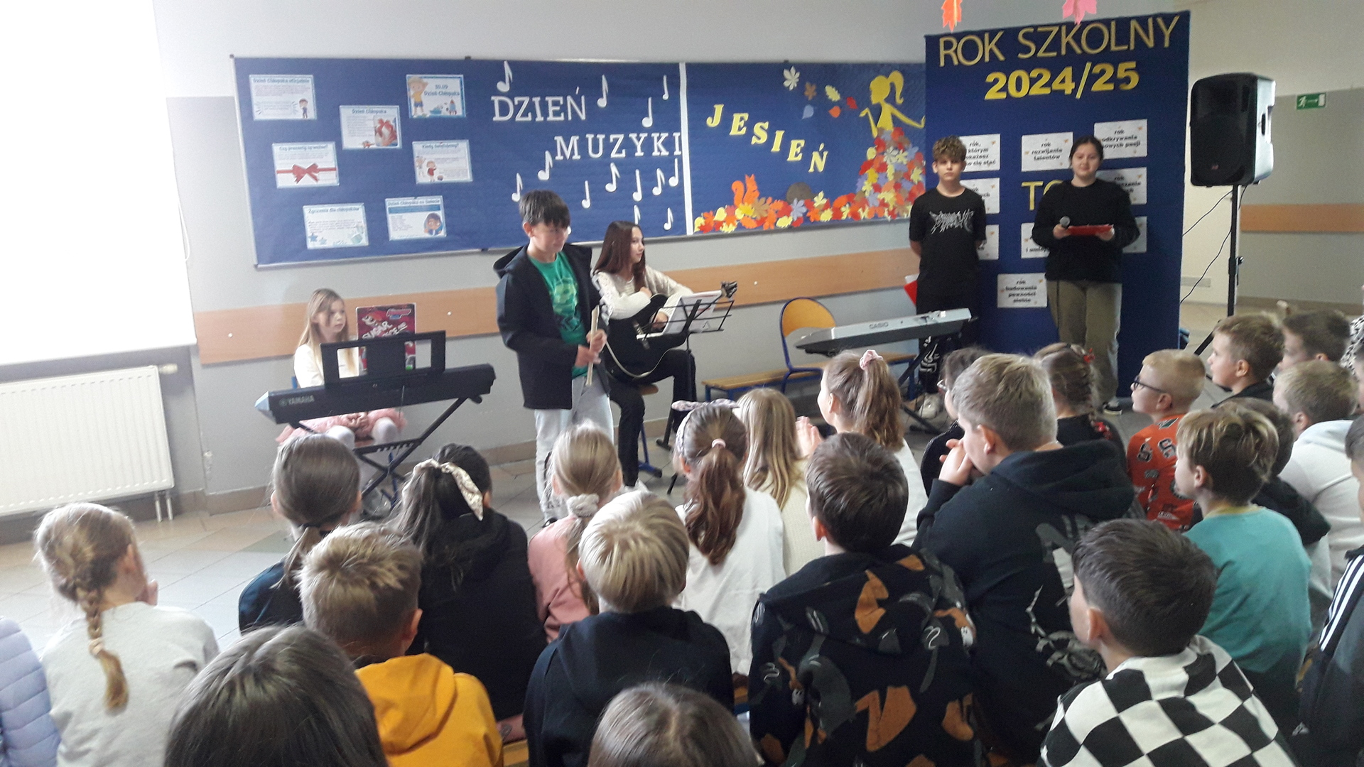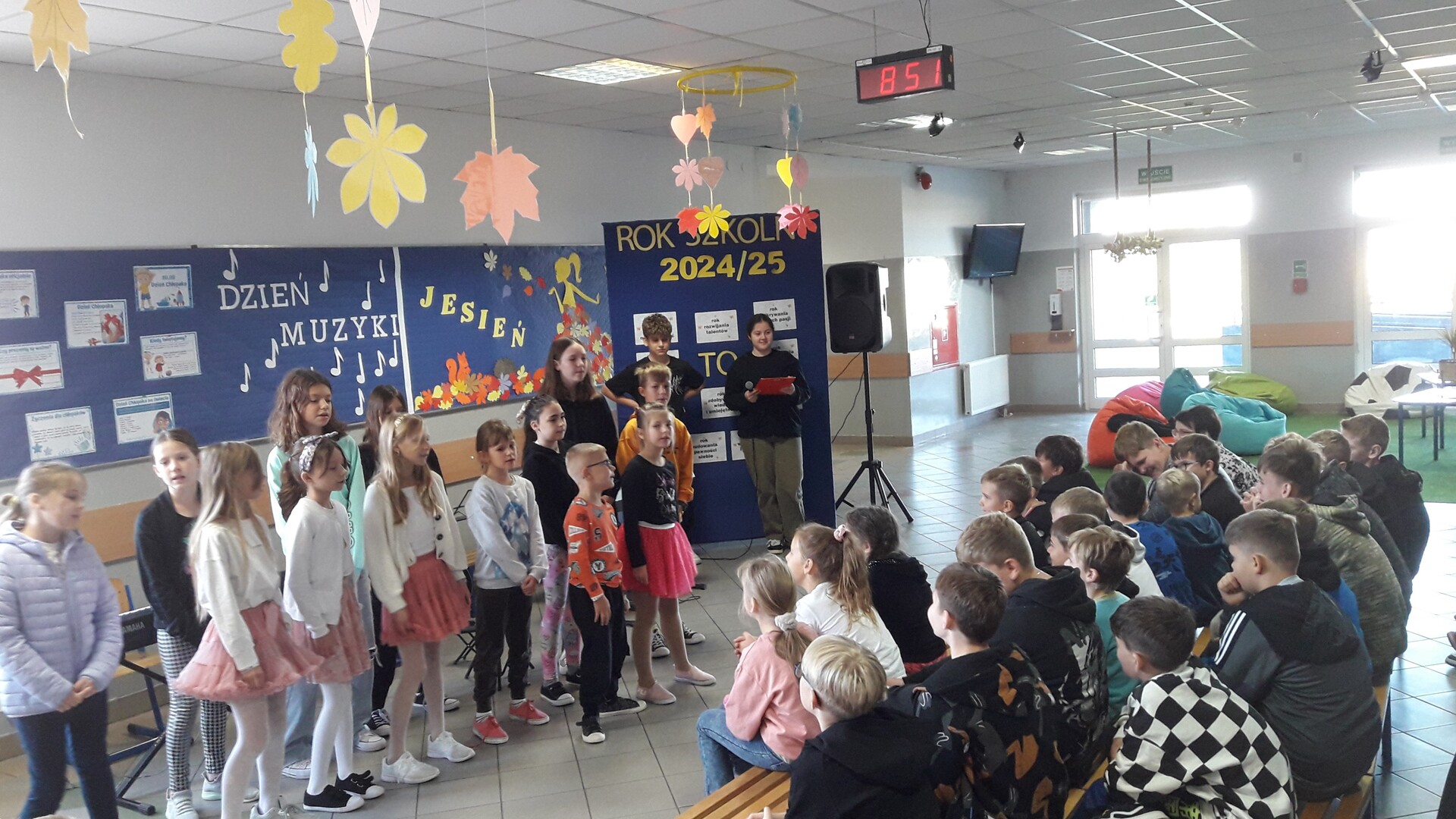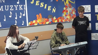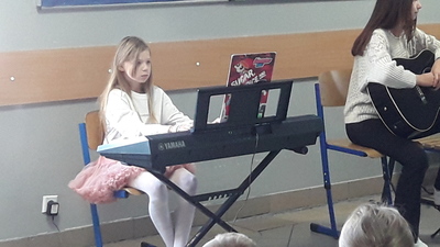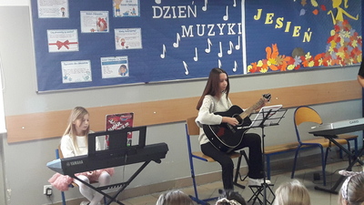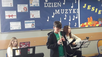 Natomiast 1 października obchodziliśmy Międzynarodowy Dzień Muzyki. Z inicjatywy SU szkolna społeczność mogła wysłuchać koncertu, podczas którego czworo uczniów naszej szkoły zaprezentowało umiejętność gry na instrumentach. Najmłodsza z naszych wykonawców – Nadia Maciniak zagrała na keyboardzie fragment utworu Pojedziemy na łów. Grą na tym samym instrumencie popisał się również Patryk Biegański – siódmoklasista zagrał Halleluja. Jego rówieśniczka Weronika Walczak wykonała gitarowe cantabille. Ostatnim solistą był Oskar Rychlik, który grając na flecie przypomniał słuchaczom popularny motyw z piosenki Celine Dion My heart will go on. W finale minikoncertu zaprezentował się szkolny chórek, który z werwą wykonał piosenkę Sylwii Grzeszczak „Och i ach”. Swoją drogą ten tytuł to chyba najlepszy komentarz do wszystkich występów. Pewnie zgodziłaby się z tym publiczność, która z wielkim zainteresowaniem słuchała muzycznych popisów i nagradzała muzyków oklaskami.