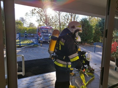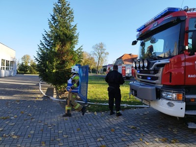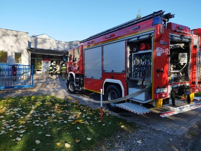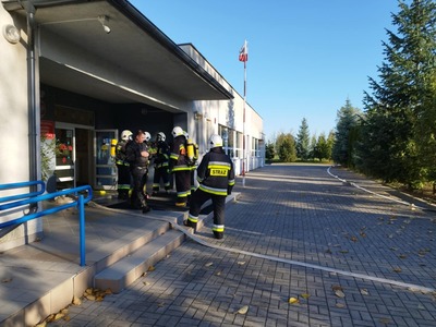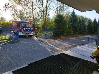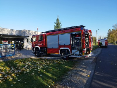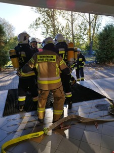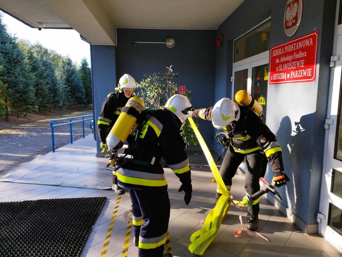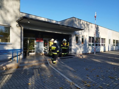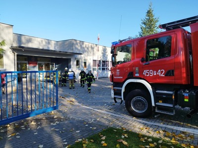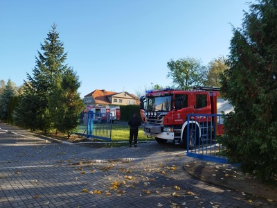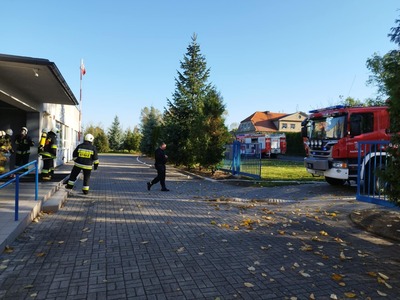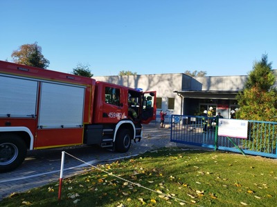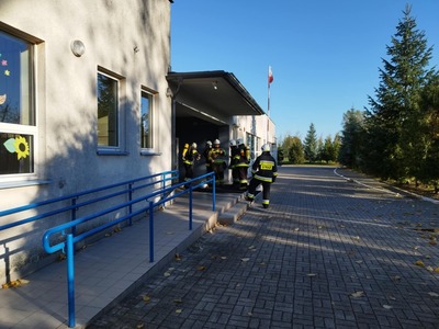 17 października tuż po godzinie 9.00 w naszej szkole rozległ się bardzo intensywny dźwięk alarmu. To sygnał dla wszystkich przebywających w budynku, by opuścić jego mury i udać się na wyznaczone miejsce zbiórki. Wszystkie dzieci, zarówno przedszkolaki jak i młodzież ze starszych klas bardzo sprawnie ewakuowały się pod opieką nauczycieli poza strefę ewentualnego zagrożenia. Będąc już na zewnątrz słyszeliśmy sygnał nadjeżdżających strażackich samochodów, a chwilę później strażacy dokonali inspekcji wnętrza szkoły.