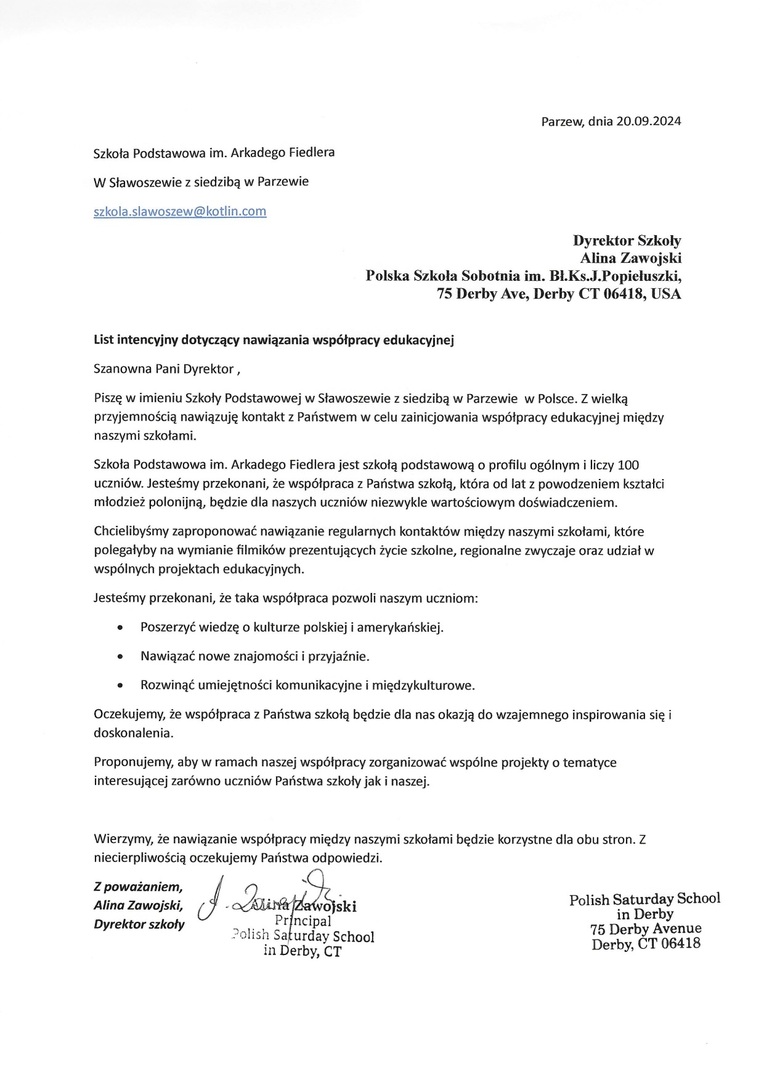 Współpraca ma polegać na regularnych kontaktach między naszymi szkołami, polegającymi m.in. na wymianie filmików prezentujących życie szkolne i regionalne zwyczaje oraz udziale we wspólnych projektach edukacyjnych.