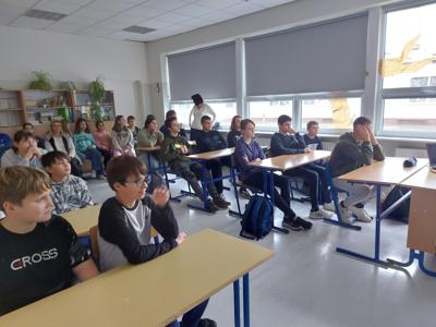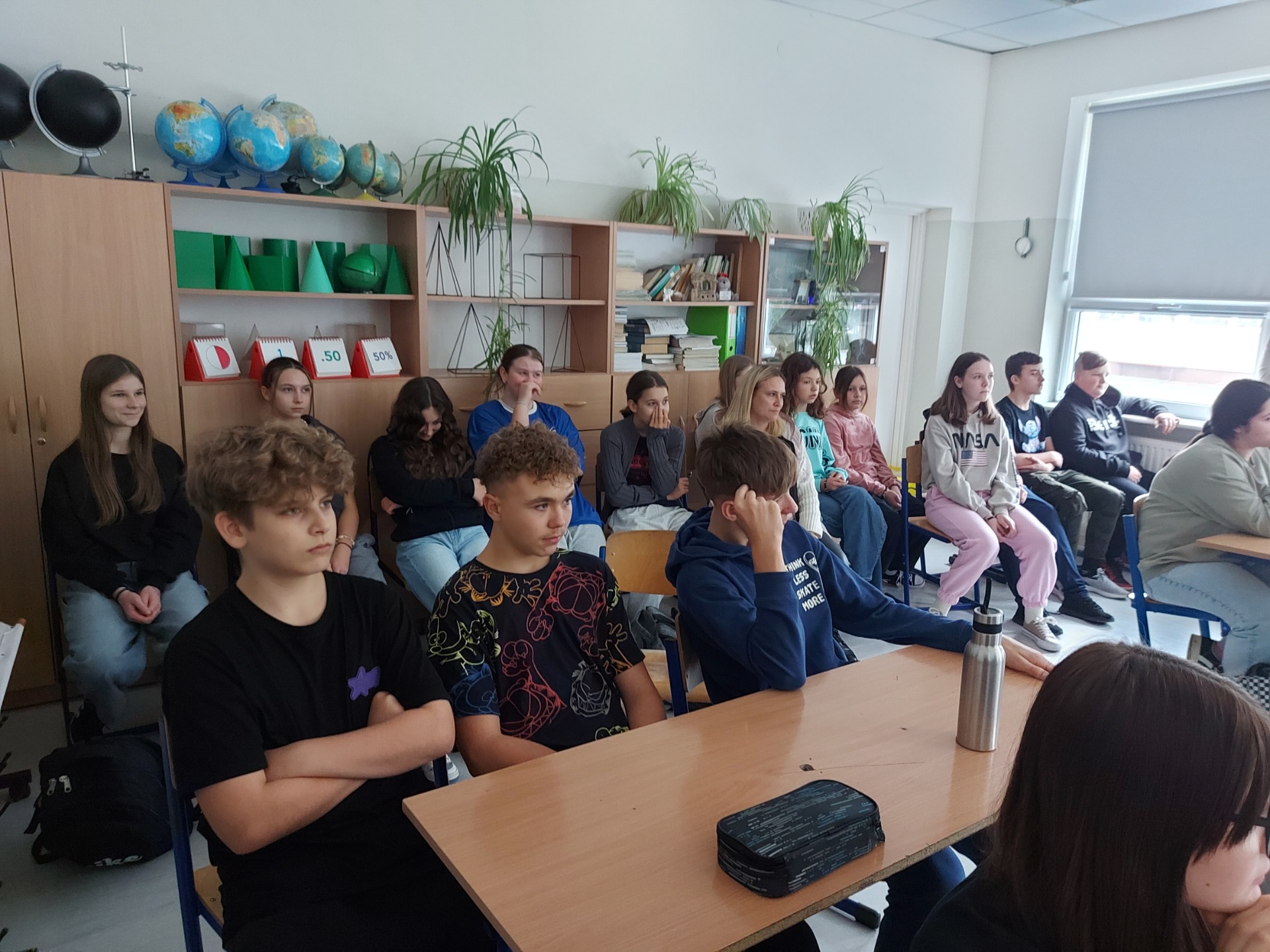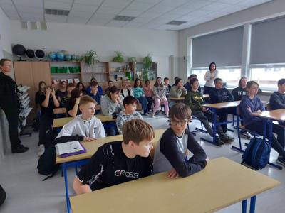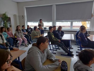 Uczniowie z uwagą słuchali wystąpienia naszych gości. Wypowiedzi policjantów, którzy na co dzień spotykają się z różnymi formami przestępstw i wykroczeń, w tym z cyberprzemocą, powinny wywrzeć odpowiednie wrażenie na młodych ludziach, to znaczy przestrzec ich przed niefrasobliwym publikowaniem różnych treści w Internecie, ale i przekonać do natychmiastowego szukania pomocy w niebezpiecznych sytuacjach.