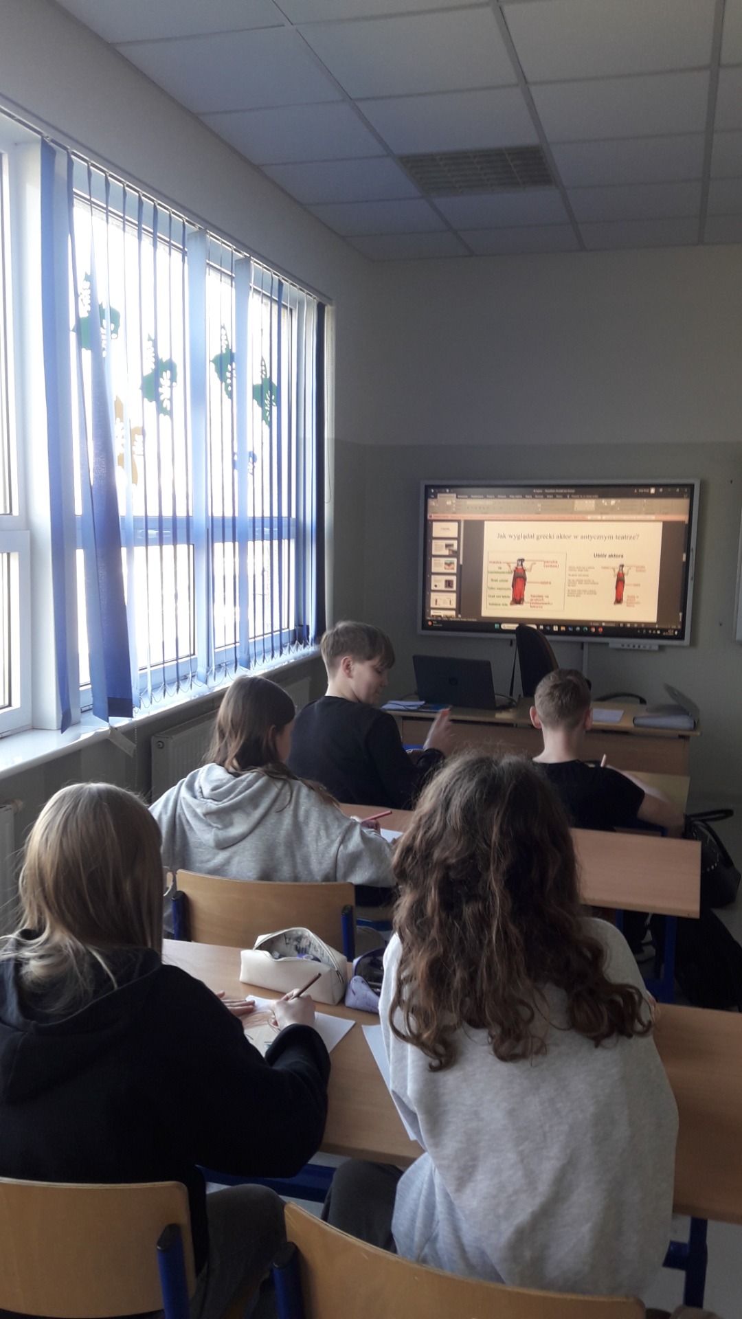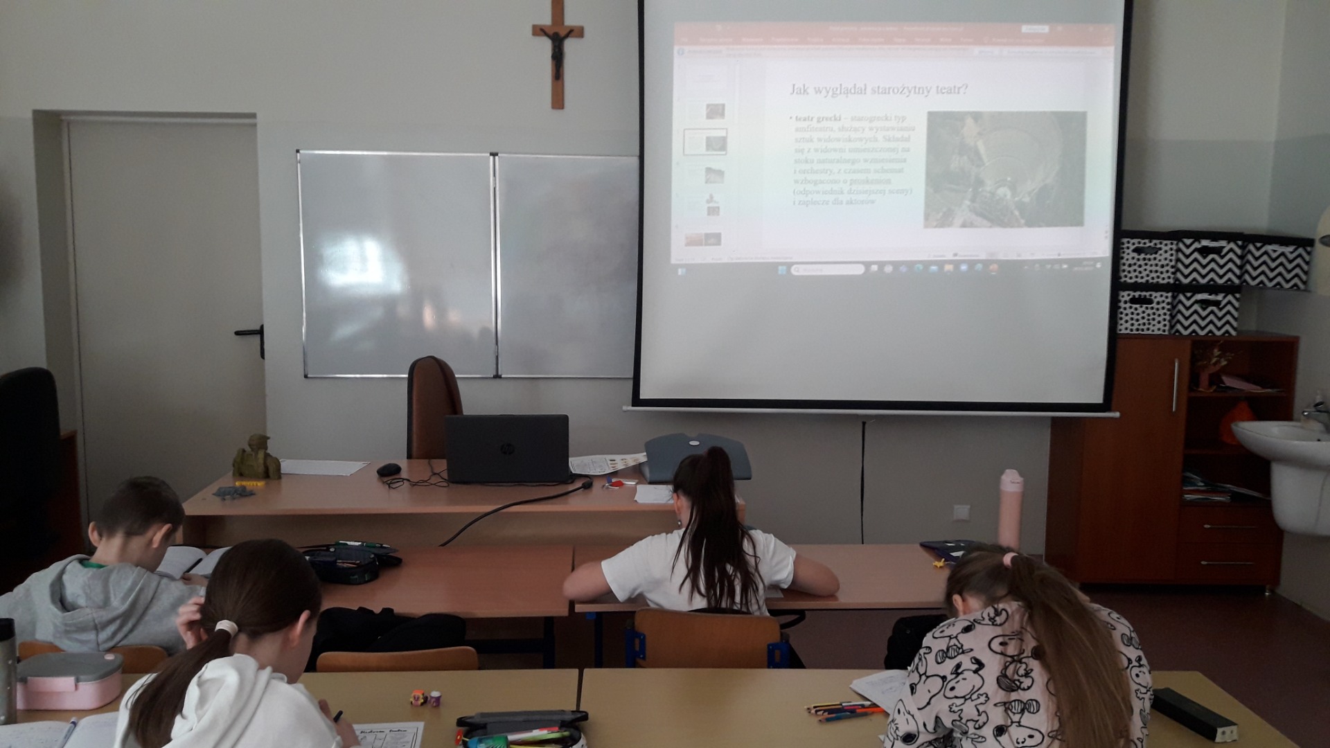 27 marca przypada Międzynarodowy Dzień Teatru. Z tej okazji klasy IV-VI wzięły udział w zajęciach przybliżających uczniom tę formę sztuki. Najpierw uczniowie obejrzeli prezentację na temat historii teatru, pochodzenia sztuk teatralnych. Dowiedzieli się, jak wyglądał starożytny grecki teatr, w jakich kostiumach prezentowali się aktorzy w antyku. Poznali zawody, które wykonują ludzie pracujący nad przygotowaniem spektaklu, takie jak reżyser, aktor, scenograf, kostiumograf czy sufler Dyskutowali również o tym, jakie umiejętności powinien mieć aktor i czy w tym zawodzie mają szansę tylko ładni ludzie.