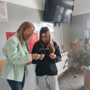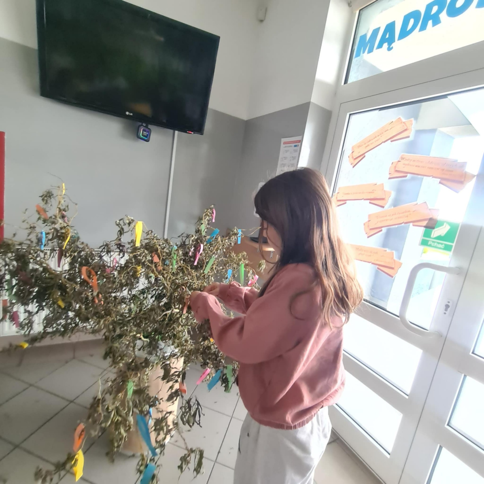 Zadaniem każdego ucznia było wybranie jednej karteczki, zdjęcie jej z drzewka i wykonanie zapisanego na niej uczynku. Dzieci z ogromnym entuzjazmem angażowały się w realizację swoich zadań – pomagając kolegom, wspierając młodszych uczniów, dzieląc się dobrym słowem i uśmiechem.